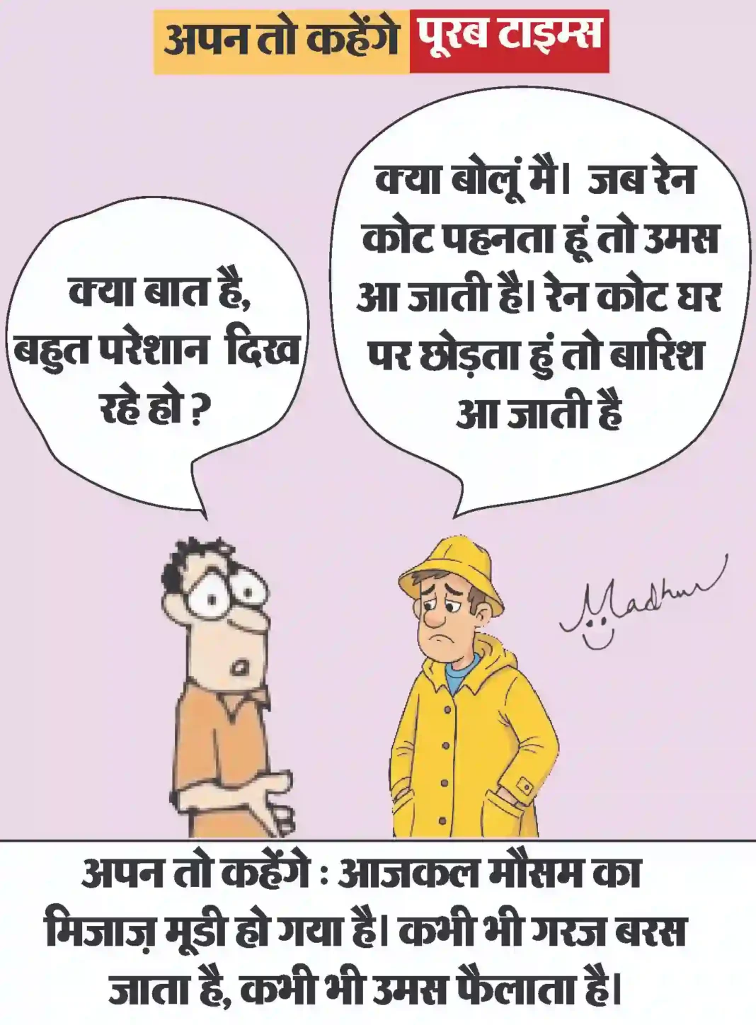 आज का कार्टून Less than 1 min.Read आज का कार्टून : आजकल मौसम का मिजाज़ मूडी हो गया है। कभी भी गरज बरस जाता है, कभी भी उमस फैलाता है। By Poorab Times September 1, 2025 Share FacebookTwitterPinterestWhatsApp More Topics आज का कार्टून आज का कार्टून : ईरान युद्ध का गहरा असर, भारत की शादियों पर भी पड़ा 😃 0 छत्तीसगढ़ प्रशिक्षु न्यायाधीश लोकतंत्र के तीसरे स्तंभ के रूप में निभाएंगे महत्वपूर्ण भूमिका : मुख्यमंत्री श्री साय 0 रायपुर। मुख्यमंत्री विष्णु देव साय से आज विधानसभा स्थित... देश बिहार भर्ती बोर्ड की गंभीर लापरवाही ,एडमिट कार्ड पर पर कुत्ते की फोटो 0 बिहार के रोहतास में भर्ती परीक्षा प्रणाली की गंभीर... छत्तीसगढ़ बिहान से बदली महिलाओं की जिंदगी, आर्थिक सशक्तिकरण की राह पर बढ़ रहीं ‘लखपति दीदी’ 0 महतारी वंदन योजना और बिहान से मिली नई पहचान रायपुर।... छत्तीसगढ़ साझी मेहनत, साझा समृद्धि — ‘बिहान’ से बदल रहा ग्रामीण महिला जीवन 0 धमतरी। राष्ट्रीय ग्रामीण आजीविका मिशन के अंतर्गत संचालित छत्तीसगढ़... छत्तीसगढ़ 10,000 चूजों की क्षमता वाले एयर कंडीशनर मुर्गी फार्म का संचालन कर रही है माँ लक्ष्मी महिला समूह 0 मुर्गी फार्म से लगभग 80 हजार से अधिक का... देश धामी सरकार ने हरिद्वार कुंभ मेला 2027 के लिए 1000 करोड़ किये आवंटित 0 आध्यात्मिक पर्यटन को बढ़ावा देने और राज्य के धार्मिक... छत्तीसगढ़ खेल प्रतियोगिताओं के साथ उत्साहपूर्वक मनाया गया अंतरराष्ट्रीय महिला दिवस, महिलाओं ने दिखाया दमखम 0 एमसीबी. अंतरराष्ट्रीय महिला दिवस के अवसर पर जिला प्रशासन... इसे भी पढ़े आज का कार्टून : ईरान युद्ध का गहरा असर, भारत की शादियों पर भी पड़ा 😃 आज का कार्टून March 12, 2026 आज का कार्टून : बीमारी का शेड्यूल : सर, मेरी तबीयत खराब होने का ‘टाइम टेबल’ बीसीसीआई ने जारी कर दिया है . #... आज का कार्टून March 11, 2026 आज का कार्टून : सड़क पर अंदोलन के लिये भारत में राजनीतिक पार्टियों को भी भाड़े पर कार्यकर्ता इकट्ठे करने पड़ते हैं, हमारा जेन... आज का कार्टून March 10, 2026 आज का कार्टून : जो परमाणु हथियार उपयोग की कोशिश भी करेगा, पूरा विश्व उसके विरुद्ध खड़ा हो जायेगा आज का कार्टून March 8, 2026 आज का कार्टून : आंध्र प्रदेश सरकार ने ‘डिजिटल ब्रेक’ लगा दिया है, अब 13 से कम उम्र वाले सोशल मीडिया से आउट होंगे आज का कार्टून March 7, 2026 आज का कार्टून : क्या कहते हैं युद्ध रोकने के लिये ठंडाई के नशे में डूबे, ब्रह्मांड के सबसे बड़ा एक्सपर्ट आज का कार्टून March 3, 2026 आज का कार्टून : पाकिस्तान क्रिकेट बोर्ड का नया मंत्र: “जीतो या घर की रजिस्ट्री लाओ” आज का कार्टून March 2, 2026 आज का कार्टून : पिचकारी से रंग व गोल गुब्बारा, लगाओ सीधा अंकल के पेट पर निशाना और बोलो ‘बुरा न मानो होली है’ आज का कार्टून March 1, 2026 आज का कार्टून : महाशक्तियों की म्यूजिकल चेयर रेस में क्या रूस-चीन की ईरान युद्ध म