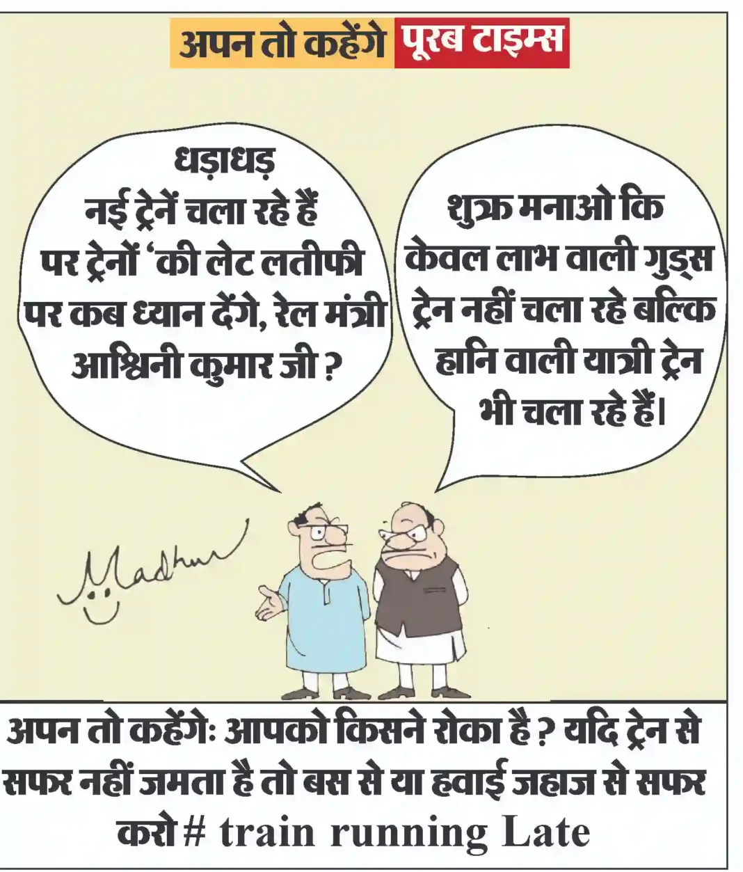 आज का कार्टून Less than 1 min.Read आज का कार्टून : आपको किसने रोका है ? यदि ट्रेन से सफर नहीं जमता है तो बस से या हवाई जहाज से सफर करो # train running Late By Poorab Times November 30, 2025 Share FacebookTwitterPinterestWhatsApp More Topics आज का कार्टून आज का कार्टून : क्या कहते हैं युद्ध रोकने के लिये ठंडाई के नशे में डूबे, ब्रह्मांड के सबसे बड़ा एक्सपर्ट 0 छत्तीसगढ़ अस्पतालों से रोजाना निकलने वाला घातक कचरा बिलासपुर वासियों के लिए बेहद चिंताजनक विषयों क्यों है ? 0 आयुक्त, नगर पालिक निगम बिलासपुर क्या घातक चिकित्सीय... छत्तीसगढ़ इंडिया स्किल 2025-26 में छत्तीसगढ़ को मिली ऐतिहासिक सफलता 0 -छत्तीसगढ़ के प्रतिभागियों ने ईस्ट ज़ोन प्रतियोगिता में जीते... देश सोनिया गांधी ने पीएम मोदी के विदेश नीति पर उठाए सवाल,चुप क्यों है सरकार 0 राहुल गांधी ने स्पष्ट कहा कि सुरक्षा चिंताएँ वास्तविक... महिला जगत रूखे बालों में आ जाएगी जान, एलोवेरा के इस आसान नुस्खे से बनाएं नेचुरल कंडीशनर 0 प्रदूषण, केमिकल युक्त हेयर प्रोडक्ट्स और गलत हेयर केयर... महिला जगत होली के मौके पर ठंडी-ठंडी ठंडाई घर पर ही बनाएं 0 होली में रंग खेलने के बाद जब गला सूख... छत्तीसगढ़ 90 वर्षीय चाका बाई पुनः सुन सकती है जीवन की मधुर ध्वनि 0 -मुख्यमंत्री कैंप कार्यालय में श्रवणदोष से पीड़ित चाका बाई... छत्तीसगढ़ 18 दिवसीय सर्विस ऑन व्हील्स अभियान बना जनसेवा की मिसाल, हजारों दिव्यांगजन एवं वृद्धजन लाभान्वित 0 जिले में समाज कल्याण विभाग द्वारा संचालित 18 दिवसीय... इसे भी पढ़े आज का कार्टून : क्या कहते हैं युद्ध रोकने के लिये ठंडाई के नशे में डूबे, ब्रह्मांड के सबसे बड़ा एक्सपर्ट आज का कार्टून March 3, 2026 आज का कार्टून : पाकिस्तान क्रिकेट बोर्ड का नया मंत्र: “जीतो या घर की रजिस्ट्री लाओ” आज का कार्टून March 2, 2026 आज का कार्टून : पिचकारी से रंग व गोल गुब्बारा, लगाओ सीधा अंकल के पेट पर निशाना और बोलो ‘बुरा न मानो होली है’ आज का कार्टून March 1, 2026 आज का कार्टून : महाशक्तियों की म्यूजिकल चेयर रेस में क्या रूस-चीन की ईरान युद्ध में ‘बैकडोर’ एंट्री होगी ? आज का कार्टून February 28, 2026 आज का कार्टून : क्या 64 रन से लंका दहन कर सेमीफाइनल की ‘राह’ ढूँढ पाएगा पाकिस्तान? आज का कार्टून February 28, 2026 आज का कार्टून : सत्य पहले जीता था या अभी जीता है , वह तो सत्य ही जानता है . पर चुनाव हारने का... आज का कार्टून February 27, 2026 आज का कार्टून : एआई और ड्रोन की एंट्री से अब छत्तीसगढ़ का किसान खेत में केवल पसीना ही नहीं, बल्कि ‘सॉफ्टवेयर’ भी चलाएगा... आज का कार्टून February 26, 2026 आज का कार्टून : आप इन आत्मनिर्भर ब्रेक्स के लिए कोई मजबूत शू ब्रांड तलाश रही हैं? 😊 आज का कार्टून February 25, 2026 आज का कार्टून : सियासत का बुलडोजर बनाम शास्त्र की आस्था – किसमें कितना हैं दम ? आज का कार्टून February 24, 2026
