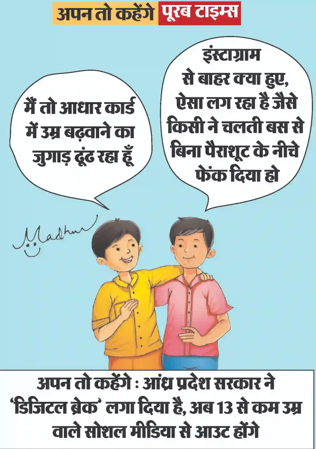आज का कार्टून Less than 1 min.Read आज का कार्टून : आंध्र प्रदेश सरकार ने ‘डिजिटल ब्रेक’ लगा दिया है, अब 13 से कम उम्र वाले सोशल मीडिया से आउट होंगे By Poorab Times March 7, 2026 Share FacebookTwitterPinterestWhatsApp More Topics छत्तीसगढ़ यूपीएससी सिविल सेवा परीक्षा में 35वीं रैंक प्राप्त करने वाली सुश्री वैभवी अग्रवाल को मुख्यमंत्री ने दी बधाई 0 कड़ी मेहनत और लगन से कोई भी लक्ष्य असंभव... छत्तीसगढ़ अंतर्राष्ट्रीय महिला दिवस पर विशेष लेख : अंतर्राष्ट्रीय महिला दिवस: स्व-सहायता समूहों के माध्यम से आत्मनिर्भर बन रहीं धमतरी जिले की महिलाएं 0 प्रतिवर्ष 8 मार्च को अंतर्राष्ट्रीय महिला दिवस मनाया जाता... छत्तीसगढ़ बिहान से सशक्त हो रहीं ग्रामीण महिलाएं, स्व सहायता समूह से जुड़कर बना रहीं अपनी अलग पहचान 0 संघर्ष से सफलता तकः सावित्री उरांव की प्रेरक कहानीप्रशिक्षण... छत्तीसगढ़ महतारी गौरव वर्ष’ : महिला सशक्तिकरण के नवयुग की ओर अग्रसर छत्तीसगढ़ 0 मुख्यमंत्री विष्णु देव साय के नेतृत्व में छत्तीसगढ़ आज... महिला जगत बाथ टॉवल की सही देखभाल और बदलने की जरुरी जानकारी 0 नहाने या हाथ पोंछने के बाद तौलिया हमारी त्वचा... महिला जगत रेस्टोरेंट स्टाइल खिले-खिले चावल इस आसान टिप्स से घर पर बनाएं 0 रेस्टोरेंट में मिलने वाले खिले-खिले चावल देखने में जितने... दुनिया क्या अब पाकिस्तान भी ईरान की इस जंग में शामिल होगा? आसिम मुनीर और सऊदी रक्षा मंत्री खालिद बिन सलमान की हुई अहम बैठक 0 अमेरिका-इस्राइल और ईरान के बीच बढ़ते तनाव के बीच... दुनिया US ईरानी ड्रोन से अपनी रक्षा व्यवस्था को मजबूत करने उठाया एक नया कदम 0 मध्य पूर्व में बढ़ते तनाव और ईरान के ड्रोन... इसे भी पढ़े आज का कार्टून : क्या कहते हैं युद्ध रोकने के लिये ठंडाई के नशे में डूबे, ब्रह्मांड के सबसे बड़ा एक्सपर्ट आज का कार्टून March 3, 2026 आज का कार्टून : पाकिस्तान क्रिकेट बोर्ड का नया मंत्र: “जीतो या घर की रजिस्ट्री लाओ” आज का कार्टून March 2, 2026 आज का कार्टून : पिचकारी से रंग व गोल गुब्बारा, लगाओ सीधा अंकल के पेट पर निशाना और बोलो ‘बुरा न मानो होली है’ आज का कार्टून March 1, 2026 आज का कार्टून : महाशक्तियों की म्यूजिकल चेयर रेस में क्या रूस-चीन की ईरान युद्ध में ‘बैकडोर’ एंट्री होगी ? आज का कार्टून February 28, 2026 आज का कार्टून : क्या 64 रन से लंका दहन कर सेमीफाइनल की ‘राह’ ढूँढ पाएगा पाकिस्तान? आज का कार्टून February 28, 2026 आज का कार्टून : सत्य पहले जीता था या अभी जीता है , वह तो सत्य ही जानता है . पर चुनाव हारने का... आज का कार्टून February 27, 2026 आज का कार्टून : एआई और ड्रोन की एंट्री से अब छत्तीसगढ़ का किसान खेत में केवल पसीना ही नहीं, बल्कि ‘सॉफ्टवेयर’ भी चलाएगा... आज का कार्टून February 26, 2026 आज का कार्टून : आप इन आत्मनिर्भर ब्रेक्स के लिए कोई मजबूत शू ब्रांड तलाश रही हैं? 😊 आज का कार्टून Feb