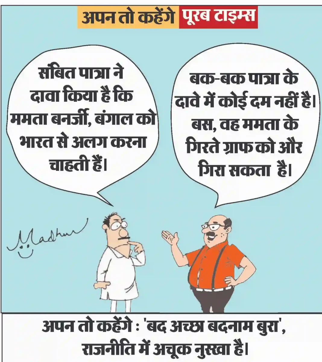 आज का कार्टून Less than 1 min.Read आज का कार्टून : “बद अच्छा बदनाम बुरा, राजनीति में अचूक नुस्खा है। By Poorab Times January 18, 2026 Share FacebookTwitterPinterestWhatsApp More Topics आज का कार्टून आज का कार्टून : क्या कहते हैं युद्ध रोकने के लिये ठंडाई के नशे में डूबे, ब्रह्मांड के सबसे बड़ा एक्सपर्ट 0 छत्तीसगढ़ अस्पतालों से रोजाना निकलने वाला घातक कचरा बिलासपुर वासियों के लिए बेहद चिंताजनक विषयों क्यों है ? 0 आयुक्त, नगर पालिक निगम बिलासपुर क्या घातक चिकित्सीय... छत्तीसगढ़ इंडिया स्किल 2025-26 में छत्तीसगढ़ को मिली ऐतिहासिक सफलता 0 -छत्तीसगढ़ के प्रतिभागियों ने ईस्ट ज़ोन प्रतियोगिता में जीते... देश सोनिया गांधी ने पीएम मोदी के विदेश नीति पर उठाए सवाल,चुप क्यों है सरकार 0 राहुल गांधी ने स्पष्ट कहा कि सुरक्षा चिंताएँ वास्तविक... महिला जगत रूखे बालों में आ जाएगी जान, एलोवेरा के इस आसान नुस्खे से बनाएं नेचुरल कंडीशनर 0 प्रदूषण, केमिकल युक्त हेयर प्रोडक्ट्स और गलत हेयर केयर... महिला जगत होली के मौके पर ठंडी-ठंडी ठंडाई घर पर ही बनाएं 0 होली में रंग खेलने के बाद जब गला सूख... छत्तीसगढ़ 90 वर्षीय चाका बाई पुनः सुन सकती है जीवन की मधुर ध्वनि 0 -मुख्यमंत्री कैंप कार्यालय में श्रवणदोष से पीड़ित चाका बाई... छत्तीसगढ़ 18 दिवसीय सर्विस ऑन व्हील्स अभियान बना जनसेवा की मिसाल, हजारों दिव्यांगजन एवं वृद्धजन लाभान्वित 0 जिले में समाज कल्याण विभाग द्वारा संचालित 18 दिवसीय... इसे भी पढ़े आज का कार्टून : क्या कहते हैं युद्ध रोकने के लिये ठंडाई के नशे में डूबे, ब्रह्मांड के सबसे बड़ा एक्सपर्ट आज का कार्टून March 3, 2026 आज का कार्टून : पाकिस्तान क्रिकेट बोर्ड का नया मंत्र: “जीतो या घर की रजिस्ट्री लाओ” आज का कार्टून March 2, 2026 आज का कार्टून : पिचकारी से रंग व गोल गुब्बारा, लगाओ सीधा अंकल के पेट पर निशाना और बोलो ‘बुरा न मानो होली है’ आज का कार्टून March 1, 2026 आज का कार्टून : महाशक्तियों की म्यूजिकल चेयर रेस में क्या रूस-चीन की ईरान युद्ध में ‘बैकडोर’ एंट्री होगी ? आज का कार्टून February 28, 2026 आज का कार्टून : क्या 64 रन से लंका दहन कर सेमीफाइनल की ‘राह’ ढूँढ पाएगा पाकिस्तान? आज का कार्टून February 28, 2026 आज का कार्टून : सत्य पहले जीता था या अभी जीता है , वह तो सत्य ही जानता है . पर चुनाव हारने का... आज का कार्टून February 27, 2026 आज का कार्टून : एआई और ड्रोन की एंट्री से अब छत्तीसगढ़ का किसान खेत में केवल पसीना ही नहीं, बल्कि ‘सॉफ्टवेयर’ भी चलाएगा... आज का कार्टून February 26, 2026 आज का कार्टून : आप इन आत्मनिर्भर ब्रेक्स के लिए कोई मजबूत शू ब्रांड तलाश रही हैं? 😊 आज का कार्टून February 25, 2026 आज का कार्टून : सियासत का बुलडोजर बनाम शास्त्र की आस्था – किसमें कितना हैं दम ? आज का कार्टून February 24, 2026