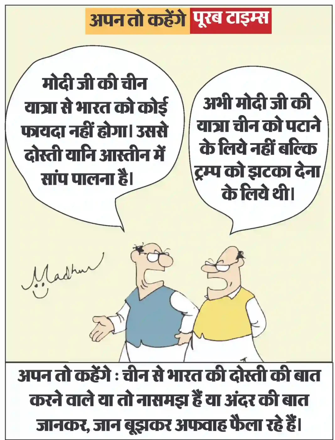 आज का कार्टून Less than 1 min.Read आज का कार्टून : चीन से भारत की दोस्ती की बात करने वाले या तो नासमझ हैं या अंदर की बात जानकर, जान बूझकर अफवाह फैला रहे हैं। By Poorab Times August 31, 2025 Share FacebookTwitterPinterestWhatsApp More Topics आज का कार्टून आज का कार्टून : ईरान युद्ध का गहरा असर, भारत की शादियों पर भी पड़ा 😃 0 छत्तीसगढ़ प्रशिक्षु न्यायाधीश लोकतंत्र के तीसरे स्तंभ के रूप में निभाएंगे महत्वपूर्ण भूमिका : मुख्यमंत्री श्री साय 0 रायपुर। मुख्यमंत्री विष्णु देव साय से आज विधानसभा स्थित... देश बिहार भर्ती बोर्ड की गंभीर लापरवाही ,एडमिट कार्ड पर पर कुत्ते की फोटो 0 बिहार के रोहतास में भर्ती परीक्षा प्रणाली की गंभीर... छत्तीसगढ़ बिहान से बदली महिलाओं की जिंदगी, आर्थिक सशक्तिकरण की राह पर बढ़ रहीं ‘लखपति दीदी’ 0 महतारी वंदन योजना और बिहान से मिली नई पहचान रायपुर।... छत्तीसगढ़ साझी मेहनत, साझा समृद्धि — ‘बिहान’ से बदल रहा ग्रामीण महिला जीवन 0 धमतरी। राष्ट्रीय ग्रामीण आजीविका मिशन के अंतर्गत संचालित छत्तीसगढ़... छत्तीसगढ़ 10,000 चूजों की क्षमता वाले एयर कंडीशनर मुर्गी फार्म का संचालन कर रही है माँ लक्ष्मी महिला समूह 0 मुर्गी फार्म से लगभग 80 हजार से अधिक का... देश धामी सरकार ने हरिद्वार कुंभ मेला 2027 के लिए 1000 करोड़ किये आवंटित 0 आध्यात्मिक पर्यटन को बढ़ावा देने और राज्य के धार्मिक... छत्तीसगढ़ खेल प्रतियोगिताओं के साथ उत्साहपूर्वक मनाया गया अंतरराष्ट्रीय महिला दिवस, महिलाओं ने दिखाया दमखम 0 एमसीबी. अंतरराष्ट्रीय महिला दिवस के अवसर पर जिला प्रशासन... इसे भी पढ़े आज का कार्टून : ईरान युद्ध का गहरा असर, भारत की शादियों पर भी पड़ा 😃 आज का कार्टून March 12, 2026 आज का कार्टून : बीमारी का शेड्यूल : सर, मेरी तबीयत खराब होने का ‘टाइम टेबल’ बीसीसीआई ने जारी कर दिया है . #... आज का कार्टून March 11, 2026 आज का कार्टून : सड़क पर अंदोलन के लिये भारत में राजनीतिक पार्टियों को भी भाड़े पर कार्यकर्ता इकट्ठे करने पड़ते हैं, हमारा जेन... आज का कार्टून March 10, 2026 आज का कार्टून : जो परमाणु हथियार उपयोग की कोशिश भी करेगा, पूरा विश्व उसके विरुद्ध खड़ा हो जायेगा आज का कार्टून March 8, 2026 आज का कार्टून : आंध्र प्रदेश सरकार ने ‘डिजिटल ब्रेक’ लगा दिया है, अब 13 से कम उम्र वाले सोशल मीडिया से आउट होंगे आज का कार्टून March 7, 2026 आज का कार्टून : क्या कहते हैं युद्ध रोकने के लिये ठंडाई के नशे में डूबे, ब्रह्मांड के सबसे बड़ा एक्सपर्ट आज का कार्टून March 3, 2026 आज का कार्टून : पाकिस्तान क्रिकेट बोर्ड का नया मंत्र: “जीतो या घर की रजिस्ट्री लाओ” आज का कार्टून March 2, 2026 आज का कार्टून : पिचकारी से रंग व गोल गुब्बारा, लगाओ सीधा अंकल के पेट पर निशाना और बोलो ‘बुरा न मानो होली है’ आज का कार्टून March 1, 2026 आज का कार्टून : महाशक्तियों की म्यूजिकल चेयर रेस में क्य