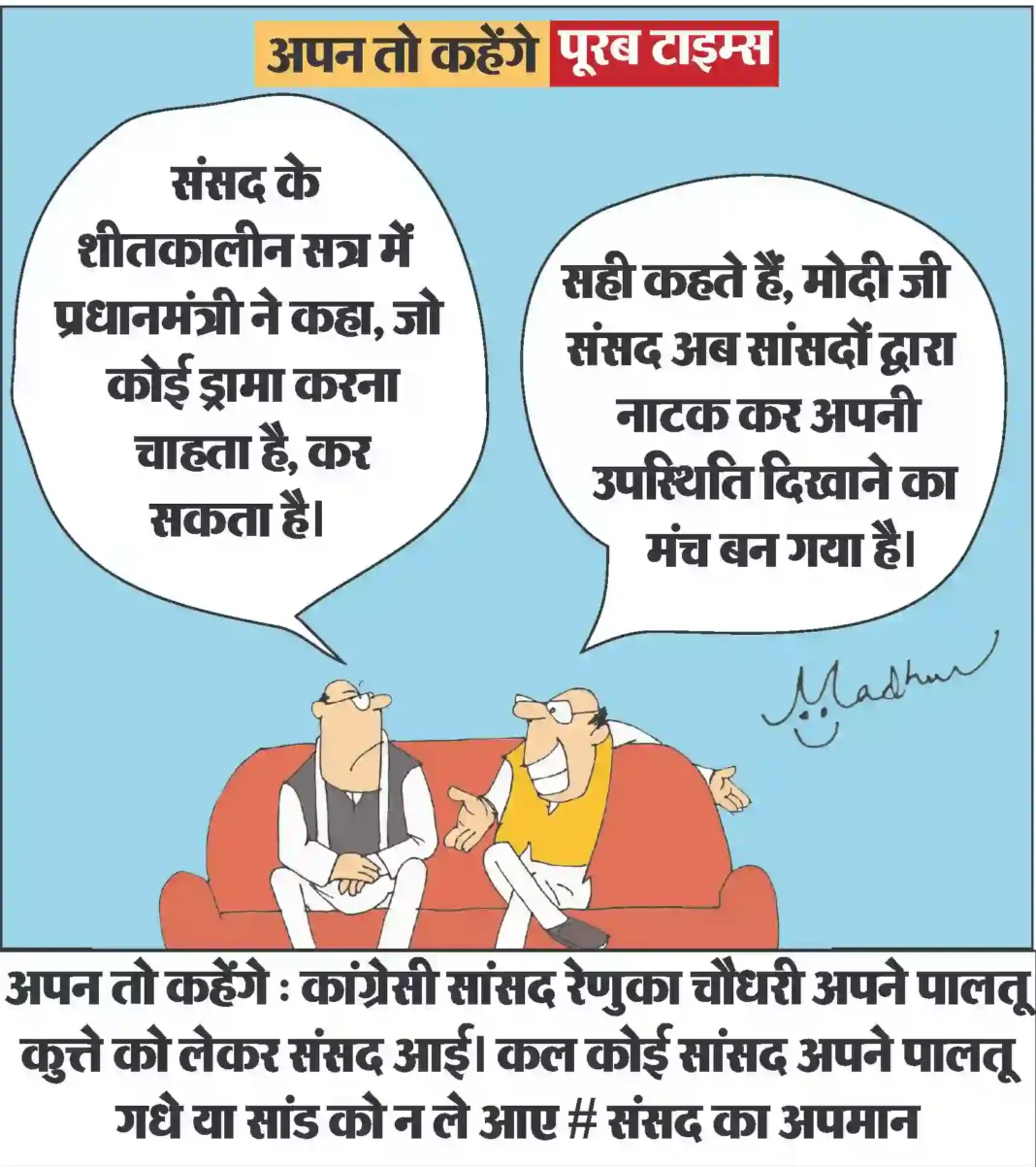 आज का कार्टून Less than 1 min.Read आज का कार्टून : कांग्रेसी सांसद रेणुका चौधरी अपने पालतू कुत्ते को लेकर संसद आई। कल कोई सांसद अपने पालतू गधे या सांड को न ले आए # संसद का अपमान By Poorab Times December 1, 2025 Share FacebookTwitterPinterestWhatsApp More Topics छत्तीसगढ़ छत्तीसगढ़ क्रांति सेना के प्रदेश अध्यक्ष अमित बघेल गिरफ्तार,26 दिनों से फरार थे 0 रायपुर. छत्तीसगढ़ क्रांति सेना के प्रदेश अध्यक्ष अमित बघेल... छत्तीसगढ़ कांग्रेस के नवनियुक्त जिलाध्यक्षों की बैठक,कई वरिष्ठ नेता होंगे शामिल 0 रायपुर। छत्तीसगढ़ कांग्रेस के नवनियुक्त 41 जिलाध्यक्षों की महत्वपूर्ण... छत्तीसगढ़ बस्तर में शांति और विकास की नई इबारत 0 नक्सल प्रभावित इलाकों में वानिकी कार्य बना रोजगार का... छत्तीसगढ़ राज्यपाल श्री डेका से छत्तीसगढ़ दिव्यांगजन, वित्त एवं विकास निगम के अध्यक्ष श्री कावड़िया ने की भेंट 0 रायपुर। राज्यपाल रमेन डेका से आज यहां लोकभवन में... छत्तीसगढ़ महिला समूह की सदस्य के परिजन को पीएम जीवन ज्योति बीमा योजना से मिला दो लाख रुपये का लाभ 0 कठिन समय में बना मजबूत सहारा रायपुर। ग्रामीण महिलाओं की... आज का कार्टून आज का कार्टून : अमरीका ने पाकिस्तान को सेट किया तो रूस का भारत से दोस्ती निभाना जरूरी हो गया। 0 देश संसद का शीतकालीन सत्र, दिन 4: दिल्ली प्रदूषण के खिलाफ विपक्ष आज करेगा प्रदर्शन 0 नई दिल्ली, 4 दिसंबर 2025।राष्ट्रीय राजधानी में लगातार बिगड़... देश कोलकाता एयरपोर्ट विवाद: सुरक्षा में सेंध या आस्था का सवाल? 130 साल पुरानी मस्जिद को लेकर मामला गरमाया 0 कोलकाता, 4 दिसंबर 2025।नेताजी सुभाष चंद्र बोस इंटरनेशनल एयरपोर्ट... इसे भी पढ़े आज का कार्टून : अमरीका ने पाकिस्तान को सेट किया तो रूस का भारत से दोस्ती निभाना जरूरी हो गया। आज का कार्टून December 5, 2025 आज का कार्टून : देश के जिम्मेदार नागरिक बने | Special Intensive Revision (SIR) में अपना वोटर आईडी वैरिफाई करायें (जनहित में जारी) आज का कार्टून December 3, 2025 आज का कार्टून : जनता यह समझ नहीं पा रही है कि क्या संसद को अखाड़ा बनाने उन्होंने पक्ष विपक्ष के सांसद चुने ? आज का कार्टून December 3, 2025 आज का कार्टून : आपको किसने रोका है ? यदि ट्रेन से सफर नहीं जमता है तो बस से या हवाई जहाज से सफर... आज का कार्टून November 30, 2025 आज का कार्टून : सैंया भये कोतवाल अब डर काहे का आज का कार्टून November 29, 2025 आज का कार्टून : अपने साथी को रावण बोलने से अपना वर्चस्व बढ़ने की जगह, साथ छूट सकता है। आज का कार्टून November 28, 2025 आज का कार्टून : कड़ाके की ठंड, गर्म कपड़ों का आनंद, बहती नाक व खरखराते गले डॉक्टर को आनंद # अपना खयाल रखें आज का कार्टून November 23, 2025 आज का कार्टून : केवल विरोध से ही नहीं बल्कि देश हित के विज़न से जनता प्रभावित होती है #RahulGandhi आज का कार्टून November 22, 2025 आज का कार्टून : यदि मुखिया खुद झूठा हो तो नीचे वालों को नीचे गिरने स