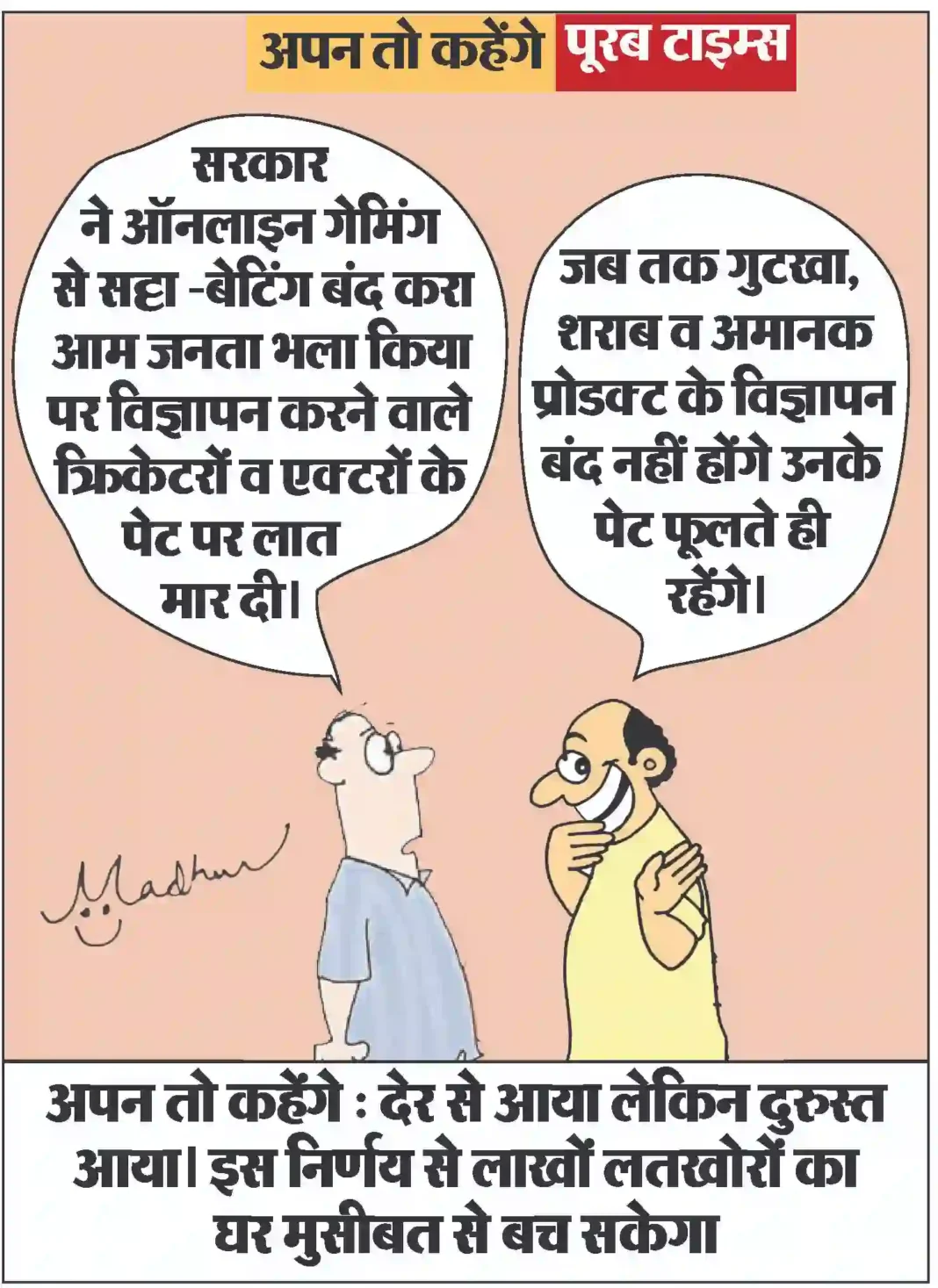 आज का कार्टून Less than 1 min.Read आज का कार्टून : देर से आया लेकिन दुरुस्त आया। इस निर्णय से लाखों लतखोरों का घर मुसीबत से बच सकेगा By Poorab Times August 23, 2025 Share FacebookTwitterPinterestWhatsApp More Topics आज का कार्टून आज का कार्टून : ट्रम्प व खोमनेई, एक दूसरे को इतनी ज़ोर ज़ोर से ललकार रहे हैं कि देखने वाले , बाकी विश्व का... 0 छत्तीसगढ़ राजीव गांधी ऑडिटोरियम टी.पी. नगर कोरबा में 18 फरवरी को होगा श्रमिक सम्मेलन का आयोजन 0 रायपुर। श्रम विभाग कोरबा द्वारा जिले के श्रमिकों को... छत्तीसगढ़ ऑल द बेस्ट, प्यारे बच्चों : मुख्यमंत्री विष्णु देव साय 0 मुख्यमंत्री ने परीक्षा दे रहे विद्यार्थियों को दिया आत्मविश्वास... छत्तीसगढ़ दृष्टि दिव्यांगता पर संकल्प की जीत: आत्मनिर्भरता की मिसाल बने अभिनंदन, अब गढ़ रहे नई प्रतिभाओं का भविष्य 0 दृढ़ इच्छाशक्ति, अटूट आत्मविश्वास और संगीत के प्रति समर्पण... छत्तीसगढ़ सुदूर अंचलों के श्रद्धालुओं को मिला अयोध्या धाम का सौभाग्य, मुख्यमंत्री ने कहा — यही जनसेवा की प्रेरणा 0 मुख्यमंत्री विष्णु देव साय ने कोरिया प्रवास के... छत्तीसगढ़ पर्यटन स्थलों के विकास और सुविधाओं के विस्तार के लिए सरकार प्रतिबद्ध — मुख्यमंत्री श्री साय 0 रायपुर।मुख्यमंत्री विष्णुदेव साय ने कोरिया प्रवास के दौरान पंचायत... आज का कार्टून आज का कार्टून : ज़ेन–ज़ी वो पीढ़ी है जो ‘पुराना बॉयफ्रेंड’ छोड़ तो देती है, पर फिर ‘पुरानी यादों’ के चक्कर में पुराने खानदान... 0 दुनिया किम जोंग की बेटी के हाथ में परमाणु बम का बटन! बहन किम यो जोंग ने दी फैसले को चुनौती 0 उत्तर कोरिया का नाम सुनते ही जेहन में एक... इसे भी पढ़े आज का कार्टून : ट्रम्प व खोमनेई, एक दूसरे को इतनी ज़ोर ज़ोर से ललकार रहे हैं कि देखने वाले , बाकी विश्व का... आज का कार्टून February 17, 2026 आज का कार्टून : ज़ेन–ज़ी वो पीढ़ी है जो ‘पुराना बॉयफ्रेंड’ छोड़ तो देती है, पर फिर ‘पुरानी यादों’ के चक्कर में पुराने खानदान... आज का कार्टून February 16, 2026 आज का कार्टून : केवल निमंत्रण से बात नहीं बनेगी. दोस्ती करने के लिए बांग्लादेश को और कोशिश करनी होगी आज का कार्टून February 15, 2026 आज का कार्टून : जो बच्चा रात भर रील देख सकता है , बस, उसे अपनी ‘स्क्रॉलिंग’ वाली उंगली को ‘राइटिंग’ में बदलना है! आज का कार्टून February 13, 2026 आज का कॉर्टून : इस केस से पता चला कि “बिन मांगे मोती मिले, मांगे मिले ना भीख” क्या होता है. आज का कार्टून February 11, 2026 आज का कार्टून : धनखड़ जी की राह पर बिरला जी : सत्ता पक्ष उन्हें बचा तो लेगा पर उस ‘झुकाव’ का क्या जो... आज का कार्टून February 10, 2026 आज का कार्टून : सरमा जी , इस बार खुद अनेक घपलों के जाल में फंस सकते हैं . अब यह देखने वाली बात... आज का कार्टून February 9, 2026 आज का कार्टून : होमवर्क की क्या जरूरत, जब क्लास ही बर्खास्त होनी है! आज का कार्टून February 8, 2026 आज का कार