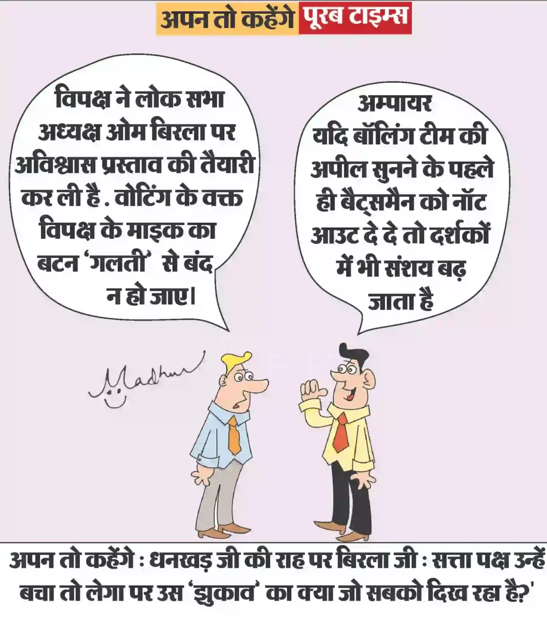 आज का कार्टून Less than 1 min.Read आज का कार्टून : धनखड़ जी की राह पर बिरला जी : सत्ता पक्ष उन्हें बचा तो लेगा पर उस ‘झुकाव’ का क्या जो सबको दिख रहा है?” By Poorab Times February 10, 2026 Share FacebookTwitterPinterestWhatsApp More Topics आज का कार्टून आज का कार्टून : जो बच्चा रात भर रील देख सकता है , बस, उसे अपनी ‘स्क्रॉलिंग’ वाली उंगली को ‘राइटिंग’ में बदलना है! 0 छत्तीसगढ़ पीएम जनमन आवास योजना से जगदीश बैगा के पक्के घर का सपना हुआ साकार 0 प्रधानमंत्री जनमन आवास योजना के तहत विकासखण्ड गौरेला के... छत्तीसगढ़ खेल प्रतिभाओं को निखारने का सशक्त माध्यम बनी सरगुजा ओलंपिक: मंत्री रामविचार नेताम 0 आदिम जाति विकास मंत्री रामविचार नेताम गुरूवार को तीन... छत्तीसगढ़ गृह, जेल मंत्री विजय शर्मा की आज छत्तीसगढ संवाद नवा रायपुर के ऑडिटोरियम में पत्रकारों से चर्चा करते हुए 0 देश पीएम मोदी असम में कुमार भास्कर वर्मा सेतु का करेंगे दौरा और देंगे 5,450 करोड़ की सौगात 0 प्रधानमंत्री नरेंद्र मोदी शनिवार को असम के दौरे पर... देश राहुल गांधी देश में ‘गृहयुद्ध भड़काने’ चाहते हैं? गिरिराज सिंह ने लगाया आरोप 0 केंद्रीय मंत्री गिरिराज सिंह ने राहुल गांधी पर किसानों... छत्तीसगढ़ मंत्री केदार कश्यप ने प्रेस कॉन्फ्रेंस में कहा -छत्तीसगढ़ में बाघों की संख्या में हुई वृद्धि 0 रायपुर। वन मंत्री केदार कश्यप आज गुरुवार काे प्रेस... महिला जगत महाशिवरात्रि पर बनाएं खास प्रसाद, भरपूर ड्राई फ्रूट्स भांग की ठंडाई 0 शिवजी की पूजा में इस खास प्रसाद का अपना... इसे भी पढ़े आज का कार्टून : जो बच्चा रात भर रील देख सकता है , बस, उसे अपनी ‘स्क्रॉलिंग’ वाली उंगली को ‘राइटिंग’ में बदलना है! आज का कार्टून February 13, 2026 आज का कॉर्टून : इस केस से पता चला कि “बिन मांगे मोती मिले, मांगे मिले ना भीख” क्या होता है. आज का कार्टून February 11, 2026 आज का कार्टून : सरमा जी , इस बार खुद अनेक घपलों के जाल में फंस सकते हैं . अब यह देखने वाली बात... आज का कार्टून February 9, 2026 आज का कार्टून : होमवर्क की क्या जरूरत, जब क्लास ही बर्खास्त होनी है! आज का कार्टून February 8, 2026 आज का कार्टून : जिनके खुद के घर शीशे के रहते हैं , उन्हें दूसरों को जबरन उंगली नहीं करना चाहिये आज का कार्टून February 7, 2026 आज का कार्टून : राज्य सभा का टिकट पक्का होने से पहले, घोटाले की फाइल पर ‘सफेद सफेदी’ का पक्का इंतजाम तो होगा ही... आज का कार्टून February 5, 2026 आज का कार्टून : संसद में दिखी नई फिल्म , “आँख मिचौली सियासत की” , एक तरफ बेतुका दर्द , दूसरी तरफ अनावश्यक तंज आज का कार्टून February 5, 2026 आज का कार्टून : दूसरे का घर जलाने चले थे, खुद की लुंगी में आग लग रही है. बांग्लादेश को भड़काना अलग बात है... आज का कार्टून February 4, 2026 आज का कार्टून : पर्यावरण विभाग का सबसे बड़ा योगदान, हर साल प्रदूषण बढ़ने पर ‘चिंता’ व्यक्त करने का रिकॉर्ड बनान