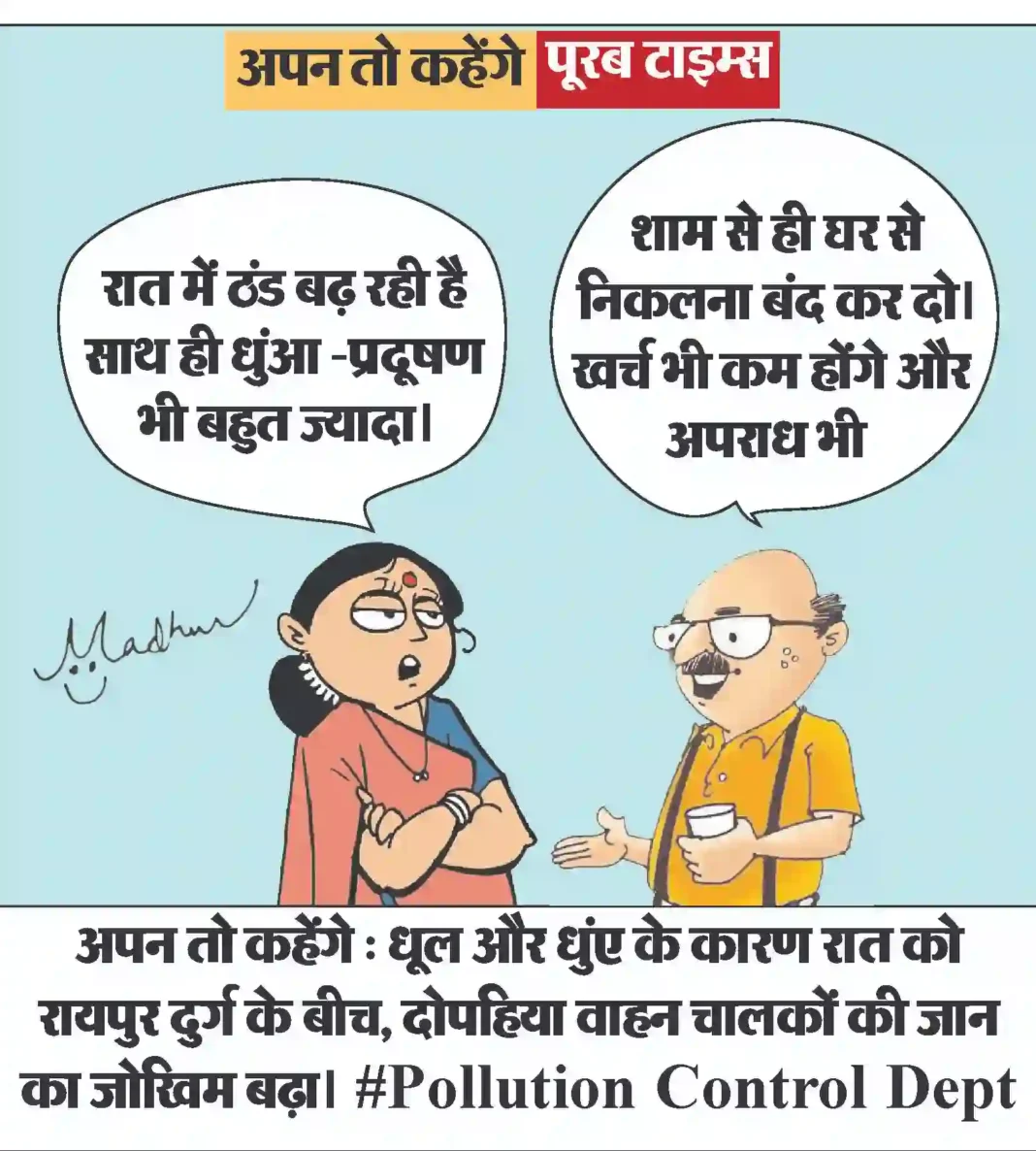 आज का कार्टून : धूल और धुंए के कारण रात को रायपुर दुर्ग के बीच, दोपहिया वाहन चालकों की जान का जोखिम बढ़ा। #pollution Control Dept