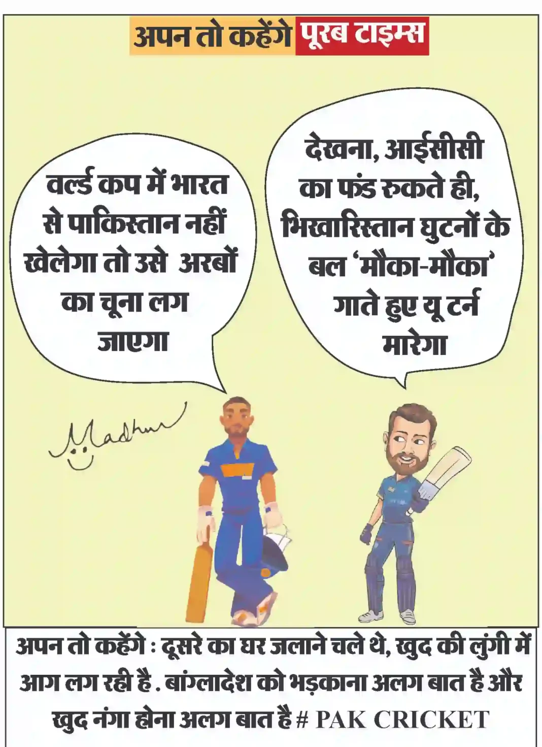 आज का कार्टून Less than 1 min.Read आज का कार्टून : दूसरे का घर जलाने चले थे, खुद की लुंगी में आग लग रही है. बांग्लादेश को भड़काना अलग बात है और खुद नंगा होना अलग बात है # PAK CRICKET By Poorab Times February 4, 2026 Share FacebookTwitterPinterestWhatsApp More Topics व्यंग्य : गुस्ताखी माफ़ इस खेल में सत्ता पक्ष कितनी भी ‘गलतियों’ पर उतर आए , विपक्ष फिर भी ‘सेल्फ गोल’ खायेगा ? 0 आजकल बीजेपी TINA फैक्टर यानी देयर इस नो आल्टरनेटिव... आज का कार्टून आज का कार्टून : जिनके खुद के घर शीशे के रहते हैं , उन्हें दूसरों को जबरन उंगली नहीं करना चाहिये 0 छत्तीसगढ़ जनजातीय परंपराओं और संस्कृति पर आधारित भव्य प्रदर्शनी का राष्ट्रपति द्रौपदी मुर्मु ने किया अवलोकन 0 बस्तर पंडुम के शुभारंभ समारोह में शामिल होने पहुंचीं... छत्तीसगढ़ रेरा प्रावधानों के प्रभावी क्रियान्वयन की दिशा में छत्तीसगढ़ रेरा का महत्वपूर्ण कदम, 14 बैंकों को फाइनल एम्पैनलमेंट किया गया 0 छत्तीसगढ़ रियल एस्टेट विनियामक प्राधिकरण ने राज्य में रियल... पर्यटन और संस्कृति अरावली हिल्स की ये 3 जगहें है इतिहास और रोमांच से भरपूर 0 कुछ समय पहले अरावली हिल्स पर चल रहे विवादों... महिला जगत यदि सफेद की जगह पीला डैंड्रफ दिखे तो हो सकता है ये गंभीर रोग, जरूर कराएं ये टेस्ट 0 अगर आप भी सिर में लगातार होने वाली खुजली... वनस्पति जड़ी बूटी देसी नुस्खे हल्दी का पाउडर ही नहीं, इसके पत्ते भी हैं सेहत का खजाना, जानें कैसे 0 हम सभी हल्दी की पाउडर या गांठ से अच्छी... छत्तीसगढ़ राष्ट्रपति द्रौपदी मुर्मू का जगदलपुर के मां दंतेश्वरी एयरपोर्ट में आत्मीय स्वागत 0 देश की राष्ट्रपति द्रौपदी मुर्मू का आज बस्तर संभाग... इसे भी पढ़े आज का कार्टून : जिनके खुद के घर शीशे के रहते हैं , उन्हें दूसरों को जबरन उंगली नहीं करना चाहिये आज का कार्टून February 7, 2026 आज का कार्टून : राज्य सभा का टिकट पक्का होने से पहले, घोटाले की फाइल पर ‘सफेद सफेदी’ का पक्का इंतजाम तो होगा ही... आज का कार्टून February 5, 2026 आज का कार्टून : संसद में दिखी नई फिल्म , “आँख मिचौली सियासत की” , एक तरफ बेतुका दर्द , दूसरी तरफ अनावश्यक तंज आज का कार्टून February 5, 2026 आज का कार्टून : पर्यावरण विभाग का सबसे बड़ा योगदान, हर साल प्रदूषण बढ़ने पर ‘चिंता’ व्यक्त करने का रिकॉर्ड बनाना है आज का कार्टून February 2, 2026 आज का कार्टून : बजट उतना ही समझ आया है , जितना मोंटेसरी के बच्चे को रॉकेट साइंस . आंकड़ों के जाल में कैल्कुलेटर... आज का कार्टून February 1, 2026 आज का कार्टून : सोना क्या सस्ता हुआ, शादी लायक लड़कियों के पिता व मोहल्ले के कुंवारे लड़कों के चेहरे पर ‘गोल्डन ग्लो’ लौट... आज का कार्टून January 31, 2026 आज का कार्टून : अब पूरे देश की आशावादी नज़र इस बार के बजट पर…. आज का कार्टून January 31, 2026 आज का कार्टून : आज की राशि फल की तर्ज पर “ट्रम्प टैरिफ फल” देखे बिना निवेश कर