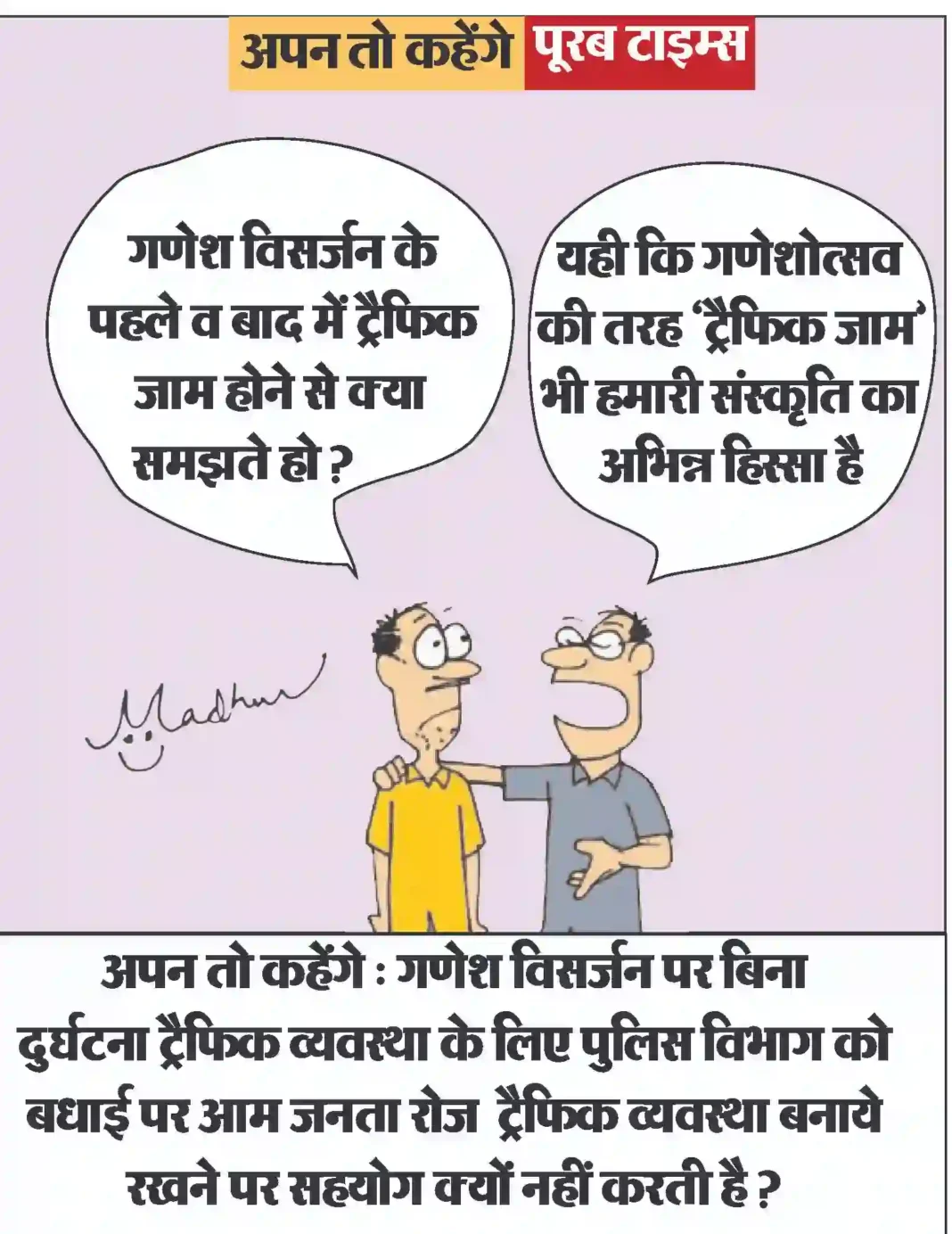 आज का कार्टून : गणेश विसर्जन पर बिना दुर्घटना ट्रैफिक व्यवस्था के लिए पुलिस विभाग को बधाई पर आम जनता रोज ट्रैफिक व्यवस्था बनाये रखने पर सहयोग क्यों नहीं करती है ?