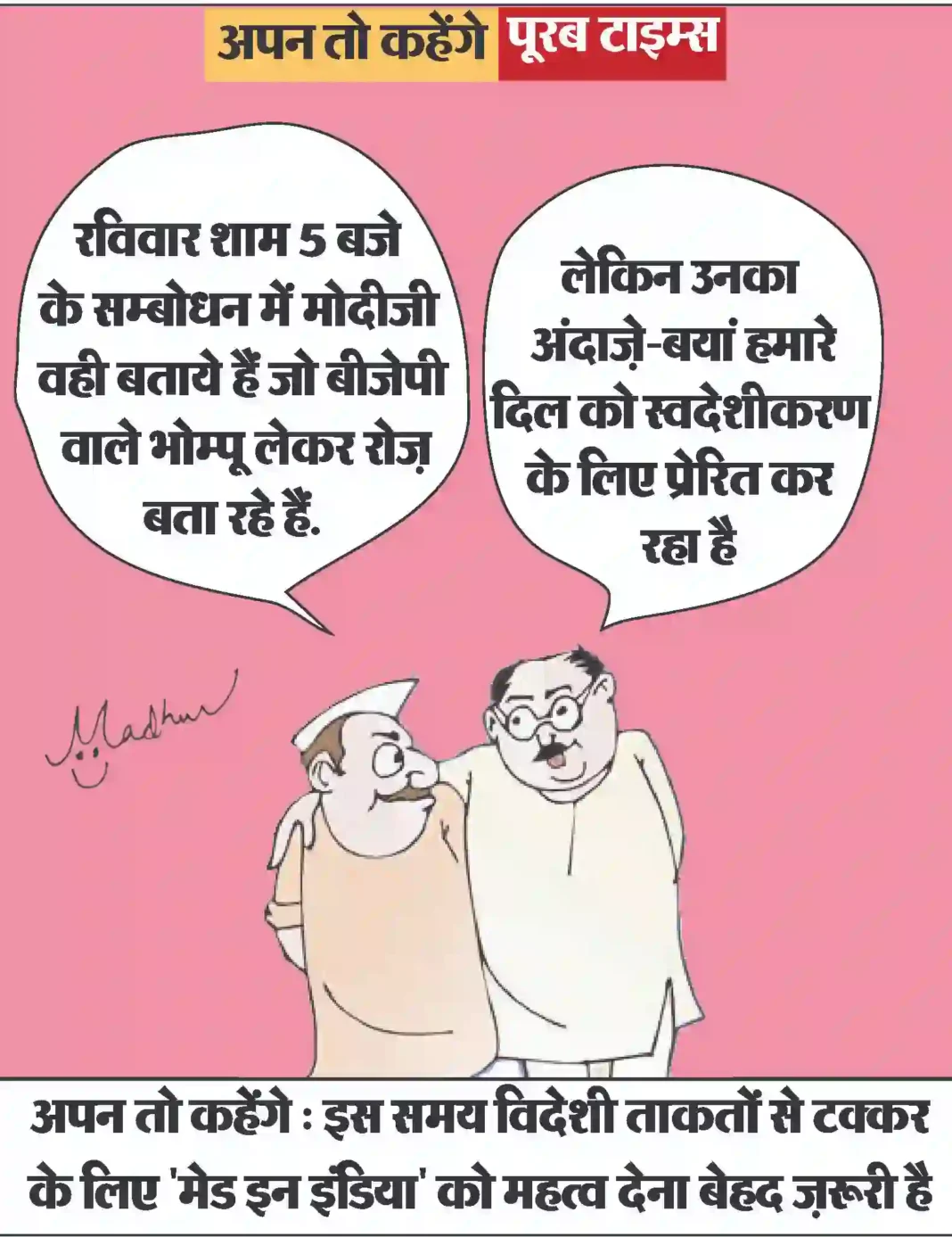 आज का कार्टून Less than 1 min.Read आज का कार्टून : इस समय विदेशी ताकतों से टक्कर के लिए “मेड इन इंडिया” को महत्व देना बेहद ज़रूरी है By Poorab Times September 21, 2025 Share FacebookTwitterPinterestWhatsApp More Topics आज का कार्टून आज का कार्टून : ईरान युद्ध का गहरा असर, भारत की शादियों पर भी पड़ा 😃 0 छत्तीसगढ़ प्रशिक्षु न्यायाधीश लोकतंत्र के तीसरे स्तंभ के रूप में निभाएंगे महत्वपूर्ण भूमिका : मुख्यमंत्री श्री साय 0 रायपुर। मुख्यमंत्री विष्णु देव साय से आज विधानसभा स्थित... देश बिहार भर्ती बोर्ड की गंभीर लापरवाही ,एडमिट कार्ड पर पर कुत्ते की फोटो 0 बिहार के रोहतास में भर्ती परीक्षा प्रणाली की गंभीर... छत्तीसगढ़ बिहान से बदली महिलाओं की जिंदगी, आर्थिक सशक्तिकरण की राह पर बढ़ रहीं ‘लखपति दीदी’ 0 महतारी वंदन योजना और बिहान से मिली नई पहचान रायपुर।... छत्तीसगढ़ साझी मेहनत, साझा समृद्धि — ‘बिहान’ से बदल रहा ग्रामीण महिला जीवन 0 धमतरी। राष्ट्रीय ग्रामीण आजीविका मिशन के अंतर्गत संचालित छत्तीसगढ़... छत्तीसगढ़ 10,000 चूजों की क्षमता वाले एयर कंडीशनर मुर्गी फार्म का संचालन कर रही है माँ लक्ष्मी महिला समूह 0 मुर्गी फार्म से लगभग 80 हजार से अधिक का... देश धामी सरकार ने हरिद्वार कुंभ मेला 2027 के लिए 1000 करोड़ किये आवंटित 0 आध्यात्मिक पर्यटन को बढ़ावा देने और राज्य के धार्मिक... छत्तीसगढ़ खेल प्रतियोगिताओं के साथ उत्साहपूर्वक मनाया गया अंतरराष्ट्रीय महिला दिवस, महिलाओं ने दिखाया दमखम 0 एमसीबी. अंतरराष्ट्रीय महिला दिवस के अवसर पर जिला प्रशासन... इसे भी पढ़े आज का कार्टून : ईरान युद्ध का गहरा असर, भारत की शादियों पर भी पड़ा 😃 आज का कार्टून March 12, 2026 आज का कार्टून : बीमारी का शेड्यूल : सर, मेरी तबीयत खराब होने का ‘टाइम टेबल’ बीसीसीआई ने जारी कर दिया है . #... आज का कार्टून March 11, 2026 आज का कार्टून : सड़क पर अंदोलन के लिये भारत में राजनीतिक पार्टियों को भी भाड़े पर कार्यकर्ता इकट्ठे करने पड़ते हैं, हमारा जेन... आज का कार्टून March 10, 2026 आज का कार्टून : जो परमाणु हथियार उपयोग की कोशिश भी करेगा, पूरा विश्व उसके विरुद्ध खड़ा हो जायेगा आज का कार्टून March 8, 2026 आज का कार्टून : आंध्र प्रदेश सरकार ने ‘डिजिटल ब्रेक’ लगा दिया है, अब 13 से कम उम्र वाले सोशल मीडिया से आउट होंगे आज का कार्टून March 7, 2026 आज का कार्टून : क्या कहते हैं युद्ध रोकने के लिये ठंडाई के नशे में डूबे, ब्रह्मांड के सबसे बड़ा एक्सपर्ट आज का कार्टून March 3, 2026 आज का कार्टून : पाकिस्तान क्रिकेट बोर्ड का नया मंत्र: “जीतो या घर की रजिस्ट्री लाओ” आज का कार्टून March 2, 2026 आज का कार्टून : पिचकारी से रंग व गोल गुब्बारा, लगाओ सीधा अंकल के पेट पर निशाना और बोलो ‘बुरा न मानो होली है’ आज का कार्टून March 1, 2026 आज का कार्टून : महाशक्तियों की म्यूजिकल चेयर रेस में क्या रूस-चीन की ईरान युद्