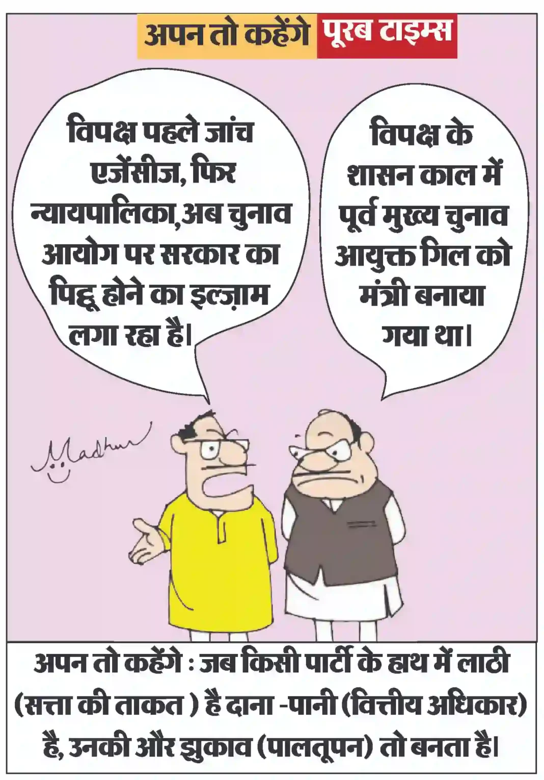 आज का कार्टून Less than 1 min.Read आज का कार्टून : जब किसी पार्टी के हाथ में लाठी (सत्ता की ताकत ) है दाना -पानी (वित्तीय अधिकार) है, उनकी और झुकाव (पालतूपन) तो बनता है। By Poorab Times August 22, 2025 Share FacebookTwitterPinterestWhatsApp More Topics आज का कार्टून आज का कार्टून : ज़ेन–ज़ी वो पीढ़ी है जो ‘पुराना बॉयफ्रेंड’ छोड़ तो देती है, पर फिर ‘पुरानी यादों’ के चक्कर में पुराने खानदान... 0 दुनिया किम जोंग की बेटी के हाथ में परमाणु बम का बटन! बहन किम यो जोंग ने दी फैसले को चुनौती 0 उत्तर कोरिया का नाम सुनते ही जेहन में एक... देश हरियाणा में 12 लोगों की मौत, क्या दूषित पानी बन रहा है काल? 0 हरियाणा के पलवल जिले के चायंसा में 15 दिनों... छत्तीसगढ़ जिले में 20 फरवरी को विशाल रोजगार मेला: निजी क्षेत्र में 50 पदों पर सीधी भर्ती का सुनहरा अवसर 0 जिले के बेरोजगार युवाओं के लिए एक महत्वपूर्ण अवसर... छत्तीसगढ़ केंदा व्यपवर्तन और सल्का नवागांव उद्वहन सिंचाई योजना के लिए 7.15 करोड़ रुपये स्वीकृत 0 रायपुर। छत्तीसगढ़-शासन, जल संसाधन विभाग द्वारा बिलासपुर जिले के... छत्तीसगढ़ राज्यपाल के गोद ग्राम टेमरी के ग्रामीणों ने किया लोकभवन का भ्रमण 0 राज्यपाल रमेन डेका की पहल पर लोकभवन की गतिविधियों... आज का कार्टून आज का कार्टून : केवल निमंत्रण से बात नहीं बनेगी. दोस्ती करने के लिए बांग्लादेश को और कोशिश करनी होगी 0 छत्तीसगढ़ लोकसंगीत और बॉलीवुड सुरों से सजा मैनपाट महोत्सव का दूसरा दिन 0 -अलका चंद्राकर और वैशाली रायकवार की प्रस्तुतियों ने देर... इसे भी पढ़े आज का कार्टून : ज़ेन–ज़ी वो पीढ़ी है जो ‘पुराना बॉयफ्रेंड’ छोड़ तो देती है, पर फिर ‘पुरानी यादों’ के चक्कर में पुराने खानदान... आज का कार्टून February 16, 2026 आज का कार्टून : केवल निमंत्रण से बात नहीं बनेगी. दोस्ती करने के लिए बांग्लादेश को और कोशिश करनी होगी आज का कार्टून February 15, 2026 आज का कार्टून : जो बच्चा रात भर रील देख सकता है , बस, उसे अपनी ‘स्क्रॉलिंग’ वाली उंगली को ‘राइटिंग’ में बदलना है! आज का कार्टून February 13, 2026 आज का कॉर्टून : इस केस से पता चला कि “बिन मांगे मोती मिले, मांगे मिले ना भीख” क्या होता है. आज का कार्टून February 11, 2026 आज का कार्टून : धनखड़ जी की राह पर बिरला जी : सत्ता पक्ष उन्हें बचा तो लेगा पर उस ‘झुकाव’ का क्या जो... आज का कार्टून February 10, 2026 आज का कार्टून : सरमा जी , इस बार खुद अनेक घपलों के जाल में फंस सकते हैं . अब यह देखने वाली बात... आज का कार्टून February 9, 2026 आज का कार्टून : होमवर्क की क्या जरूरत, जब क्लास ही बर्खास्त होनी है! आज का कार्टून February 8, 2026 आज का कार्टून : जिनके खुद के घर शीशे के रहते हैं , उन्हें दूसरों को जबरन उंगली नहीं करना चाहिये आज का कार्टून February 7, 2026 आज का कार्टून : राज्य सभा का टिकट पक्का होने से पहले, घोटाले की फाइल पर ‘सफेद सफेदी’ का पक्का इंतजाम तो होगा ही... आज क