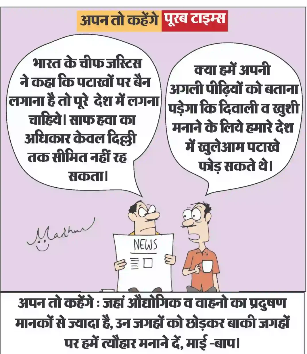 आज का कार्टून Less than 1 min.Read आज का कार्टून : जहां औद्योगिक व वाहनो का प्रदुषण मानकों से ज्यादा है, उन जगहों को छोड़कर बाकी जगहों पर हमें त्यौहार मनाने दें, माई -बाप। By Poorab Times September 13, 2025 Share FacebookTwitterPinterestWhatsApp More Topics आज का कार्टून आज का कार्टून : ईरान युद्ध का गहरा असर, भारत की शादियों पर भी पड़ा 😃 0 छत्तीसगढ़ प्रशिक्षु न्यायाधीश लोकतंत्र के तीसरे स्तंभ के रूप में निभाएंगे महत्वपूर्ण भूमिका : मुख्यमंत्री श्री साय 0 रायपुर। मुख्यमंत्री विष्णु देव साय से आज विधानसभा स्थित... देश बिहार भर्ती बोर्ड की गंभीर लापरवाही ,एडमिट कार्ड पर पर कुत्ते की फोटो 0 बिहार के रोहतास में भर्ती परीक्षा प्रणाली की गंभीर... छत्तीसगढ़ बिहान से बदली महिलाओं की जिंदगी, आर्थिक सशक्तिकरण की राह पर बढ़ रहीं ‘लखपति दीदी’ 0 महतारी वंदन योजना और बिहान से मिली नई पहचान रायपुर।... छत्तीसगढ़ साझी मेहनत, साझा समृद्धि — ‘बिहान’ से बदल रहा ग्रामीण महिला जीवन 0 धमतरी। राष्ट्रीय ग्रामीण आजीविका मिशन के अंतर्गत संचालित छत्तीसगढ़... छत्तीसगढ़ 10,000 चूजों की क्षमता वाले एयर कंडीशनर मुर्गी फार्म का संचालन कर रही है माँ लक्ष्मी महिला समूह 0 मुर्गी फार्म से लगभग 80 हजार से अधिक का... देश धामी सरकार ने हरिद्वार कुंभ मेला 2027 के लिए 1000 करोड़ किये आवंटित 0 आध्यात्मिक पर्यटन को बढ़ावा देने और राज्य के धार्मिक... छत्तीसगढ़ खेल प्रतियोगिताओं के साथ उत्साहपूर्वक मनाया गया अंतरराष्ट्रीय महिला दिवस, महिलाओं ने दिखाया दमखम 0 एमसीबी. अंतरराष्ट्रीय महिला दिवस के अवसर पर जिला प्रशासन... इसे भी पढ़े आज का कार्टून : ईरान युद्ध का गहरा असर, भारत की शादियों पर भी पड़ा 😃 आज का कार्टून March 12, 2026 आज का कार्टून : बीमारी का शेड्यूल : सर, मेरी तबीयत खराब होने का ‘टाइम टेबल’ बीसीसीआई ने जारी कर दिया है . #... आज का कार्टून March 11, 2026 आज का कार्टून : सड़क पर अंदोलन के लिये भारत में राजनीतिक पार्टियों को भी भाड़े पर कार्यकर्ता इकट्ठे करने पड़ते हैं, हमारा जेन... आज का कार्टून March 10, 2026 आज का कार्टून : जो परमाणु हथियार उपयोग की कोशिश भी करेगा, पूरा विश्व उसके विरुद्ध खड़ा हो जायेगा आज का कार्टून March 8, 2026 आज का कार्टून : आंध्र प्रदेश सरकार ने ‘डिजिटल ब्रेक’ लगा दिया है, अब 13 से कम उम्र वाले सोशल मीडिया से आउट होंगे आज का कार्टून March 7, 2026 आज का कार्टून : क्या कहते हैं युद्ध रोकने के लिये ठंडाई के नशे में डूबे, ब्रह्मांड के सबसे बड़ा एक्सपर्ट आज का कार्टून March 3, 2026 आज का कार्टून : पाकिस्तान क्रिकेट बोर्ड का नया मंत्र: “जीतो या घर की रजिस्ट्री लाओ” आज का कार्टून March 2, 2026 आज का कार्टून : पिचकारी से रंग व गोल गुब्बारा, लगाओ सीधा अंकल के पेट पर निशाना और बोलो ‘बुरा न मानो होली है’ आज का कार्टून March 1, 2026 आज का कार्टून : महाशक्तियों की म्यूजिकल 