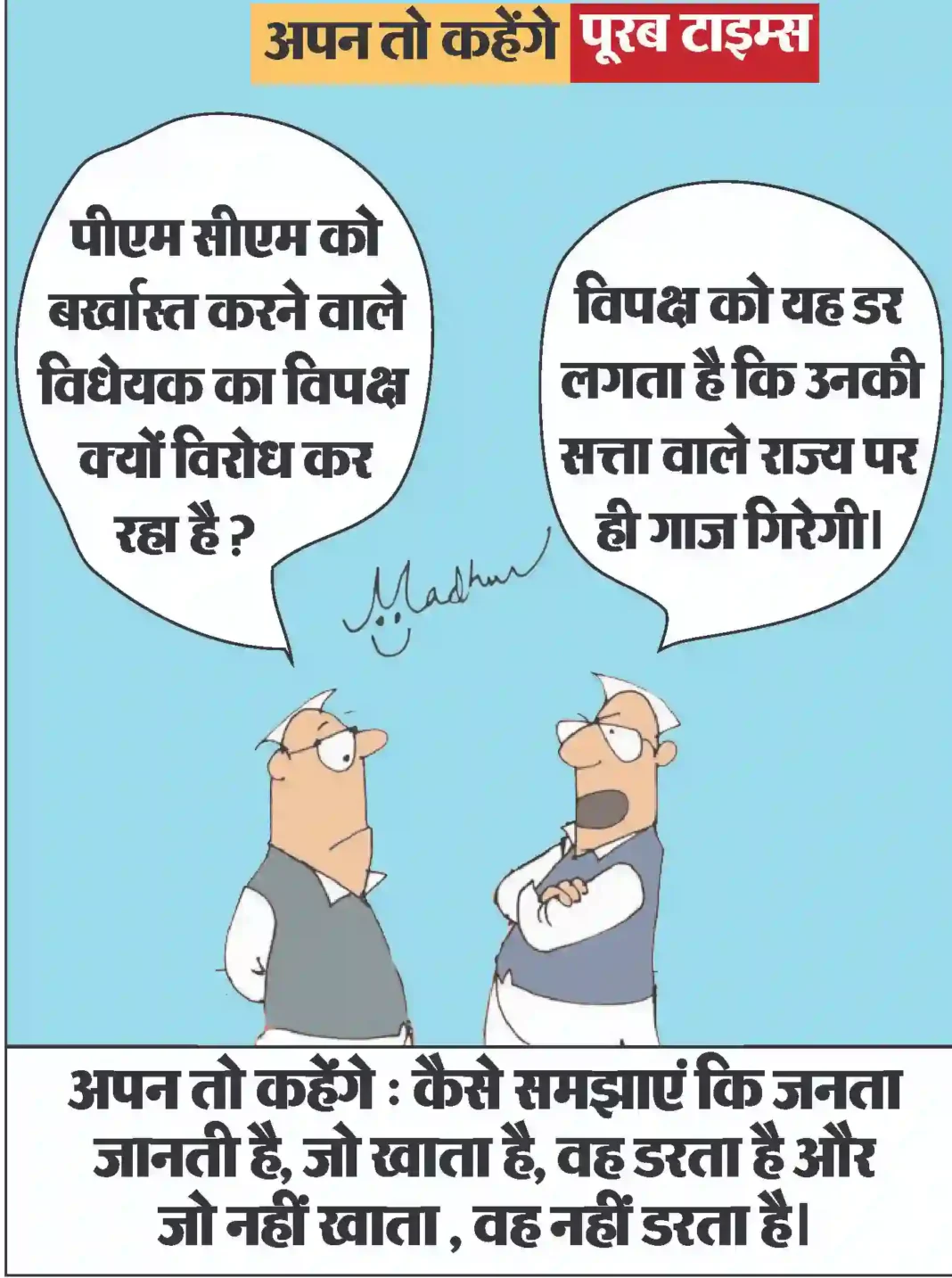 आज का कार्टून Less than 1 min.Read आज का कार्टून : कैसे समझाएं कि जनता जानती है, जो खाता है, वह डरता है और जो नहीं खाता, वह नहीं डरता है। By Poorab Times August 24, 2025 Share FacebookTwitterPinterestWhatsApp More Topics आज का कार्टून आज का कार्टून : ईरान युद्ध का गहरा असर, भारत की शादियों पर भी पड़ा 😃 0 छत्तीसगढ़ प्रशिक्षु न्यायाधीश लोकतंत्र के तीसरे स्तंभ के रूप में निभाएंगे महत्वपूर्ण भूमिका : मुख्यमंत्री श्री साय 0 रायपुर। मुख्यमंत्री विष्णु देव साय से आज विधानसभा स्थित... देश बिहार भर्ती बोर्ड की गंभीर लापरवाही ,एडमिट कार्ड पर पर कुत्ते की फोटो 0 बिहार के रोहतास में भर्ती परीक्षा प्रणाली की गंभीर... छत्तीसगढ़ बिहान से बदली महिलाओं की जिंदगी, आर्थिक सशक्तिकरण की राह पर बढ़ रहीं ‘लखपति दीदी’ 0 महतारी वंदन योजना और बिहान से मिली नई पहचान रायपुर।... छत्तीसगढ़ साझी मेहनत, साझा समृद्धि — ‘बिहान’ से बदल रहा ग्रामीण महिला जीवन 0 धमतरी। राष्ट्रीय ग्रामीण आजीविका मिशन के अंतर्गत संचालित छत्तीसगढ़... छत्तीसगढ़ 10,000 चूजों की क्षमता वाले एयर कंडीशनर मुर्गी फार्म का संचालन कर रही है माँ लक्ष्मी महिला समूह 0 मुर्गी फार्म से लगभग 80 हजार से अधिक का... देश धामी सरकार ने हरिद्वार कुंभ मेला 2027 के लिए 1000 करोड़ किये आवंटित 0 आध्यात्मिक पर्यटन को बढ़ावा देने और राज्य के धार्मिक... छत्तीसगढ़ खेल प्रतियोगिताओं के साथ उत्साहपूर्वक मनाया गया अंतरराष्ट्रीय महिला दिवस, महिलाओं ने दिखाया दमखम 0 एमसीबी. अंतरराष्ट्रीय महिला दिवस के अवसर पर जिला प्रशासन... इसे भी पढ़े आज का कार्टून : ईरान युद्ध का गहरा असर, भारत की शादियों पर भी पड़ा 😃 आज का कार्टून March 12, 2026 आज का कार्टून : बीमारी का शेड्यूल : सर, मेरी तबीयत खराब होने का ‘टाइम टेबल’ बीसीसीआई ने जारी कर दिया है . #... आज का कार्टून March 11, 2026 आज का कार्टून : सड़क पर अंदोलन के लिये भारत में राजनीतिक पार्टियों को भी भाड़े पर कार्यकर्ता इकट्ठे करने पड़ते हैं, हमारा जेन... आज का कार्टून March 10, 2026 आज का कार्टून : जो परमाणु हथियार उपयोग की कोशिश भी करेगा, पूरा विश्व उसके विरुद्ध खड़ा हो जायेगा आज का कार्टून March 8, 2026 आज का कार्टून : आंध्र प्रदेश सरकार ने ‘डिजिटल ब्रेक’ लगा दिया है, अब 13 से कम उम्र वाले सोशल मीडिया से आउट होंगे आज का कार्टून March 7, 2026 आज का कार्टून : क्या कहते हैं युद्ध रोकने के लिये ठंडाई के नशे में डूबे, ब्रह्मांड के सबसे बड़ा एक्सपर्ट आज का कार्टून March 3, 2026 आज का कार्टून : पाकिस्तान क्रिकेट बोर्ड का नया मंत्र: “जीतो या घर की रजिस्ट्री लाओ” आज का कार्टून March 2, 2026 आज का कार्टून : पिचकारी से रंग व गोल गुब्बारा, लगाओ सीधा अंकल के पेट पर निशाना और बोलो ‘बुरा न मानो होली है’ आज का कार्टून March 1, 2026 आज का कार्टून : महाशक्तियों की म्यूजिकल चेयर रेस में क्या रूस-चीन की ईरान युद्