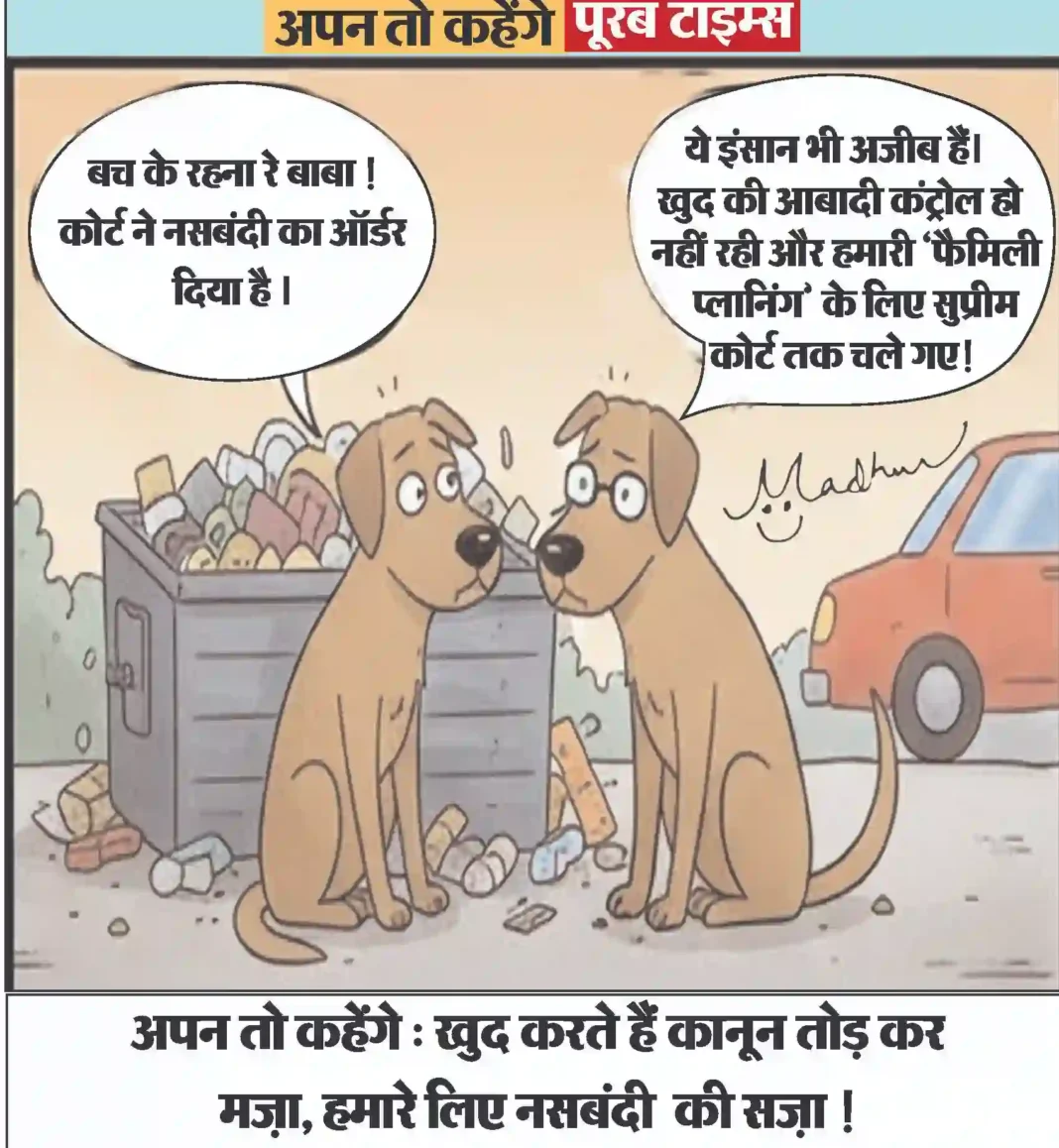 आज का कार्टून Less than 1 min.Read आज का कार्टून : खुद करते हैं कानून तोड़ कर मज़ा , हमारे लिए नसबंदी की सज़ा ! By Poorab Times January 19, 2026 Share FacebookTwitterPinterestWhatsApp More Topics आज का कार्टून आज का कार्टून : ईरान युद्ध का गहरा असर, भारत की शादियों पर भी पड़ा 😃 0 छत्तीसगढ़ प्रशिक्षु न्यायाधीश लोकतंत्र के तीसरे स्तंभ के रूप में निभाएंगे महत्वपूर्ण भूमिका : मुख्यमंत्री श्री साय 0 रायपुर। मुख्यमंत्री विष्णु देव साय से आज विधानसभा स्थित... देश बिहार भर्ती बोर्ड की गंभीर लापरवाही ,एडमिट कार्ड पर पर कुत्ते की फोटो 0 बिहार के रोहतास में भर्ती परीक्षा प्रणाली की गंभीर... छत्तीसगढ़ बिहान से बदली महिलाओं की जिंदगी, आर्थिक सशक्तिकरण की राह पर बढ़ रहीं ‘लखपति दीदी’ 0 महतारी वंदन योजना और बिहान से मिली नई पहचान रायपुर।... छत्तीसगढ़ साझी मेहनत, साझा समृद्धि — ‘बिहान’ से बदल रहा ग्रामीण महिला जीवन 0 धमतरी। राष्ट्रीय ग्रामीण आजीविका मिशन के अंतर्गत संचालित छत्तीसगढ़... छत्तीसगढ़ 10,000 चूजों की क्षमता वाले एयर कंडीशनर मुर्गी फार्म का संचालन कर रही है माँ लक्ष्मी महिला समूह 0 मुर्गी फार्म से लगभग 80 हजार से अधिक का... देश धामी सरकार ने हरिद्वार कुंभ मेला 2027 के लिए 1000 करोड़ किये आवंटित 0 आध्यात्मिक पर्यटन को बढ़ावा देने और राज्य के धार्मिक... छत्तीसगढ़ खेल प्रतियोगिताओं के साथ उत्साहपूर्वक मनाया गया अंतरराष्ट्रीय महिला दिवस, महिलाओं ने दिखाया दमखम 0 एमसीबी. अंतरराष्ट्रीय महिला दिवस के अवसर पर जिला प्रशासन... इसे भी पढ़े आज का कार्टून : ईरान युद्ध का गहरा असर, भारत की शादियों पर भी पड़ा 😃 आज का कार्टून March 12, 2026 आज का कार्टून : बीमारी का शेड्यूल : सर, मेरी तबीयत खराब होने का ‘टाइम टेबल’ बीसीसीआई ने जारी कर दिया है . #... आज का कार्टून March 11, 2026 आज का कार्टून : सड़क पर अंदोलन के लिये भारत में राजनीतिक पार्टियों को भी भाड़े पर कार्यकर्ता इकट्ठे करने पड़ते हैं, हमारा जेन... आज का कार्टून March 10, 2026 आज का कार्टून : जो परमाणु हथियार उपयोग की कोशिश भी करेगा, पूरा विश्व उसके विरुद्ध खड़ा हो जायेगा आज का कार्टून March 8, 2026 आज का कार्टून : आंध्र प्रदेश सरकार ने ‘डिजिटल ब्रेक’ लगा दिया है, अब 13 से कम उम्र वाले सोशल मीडिया से आउट होंगे आज का कार्टून March 7, 2026 आज का कार्टून : क्या कहते हैं युद्ध रोकने के लिये ठंडाई के नशे में डूबे, ब्रह्मांड के सबसे बड़ा एक्सपर्ट आज का कार्टून March 3, 2026 आज का कार्टून : पाकिस्तान क्रिकेट बोर्ड का नया मंत्र: “जीतो या घर की रजिस्ट्री लाओ” आज का कार्टून March 2, 2026 आज का कार्टून : पिचकारी से रंग व गोल गुब्बारा, लगाओ सीधा अंकल के पेट पर निशाना और बोलो ‘बुरा न मानो होली है’ आज का कार्टून March 1, 2026 आज का कार्टून : महाशक्तियों की म्यूजिकल चेयर रेस में क्या रूस-चीन की ईरान युद्ध में ‘बैकडोर’ एंट्री हो
