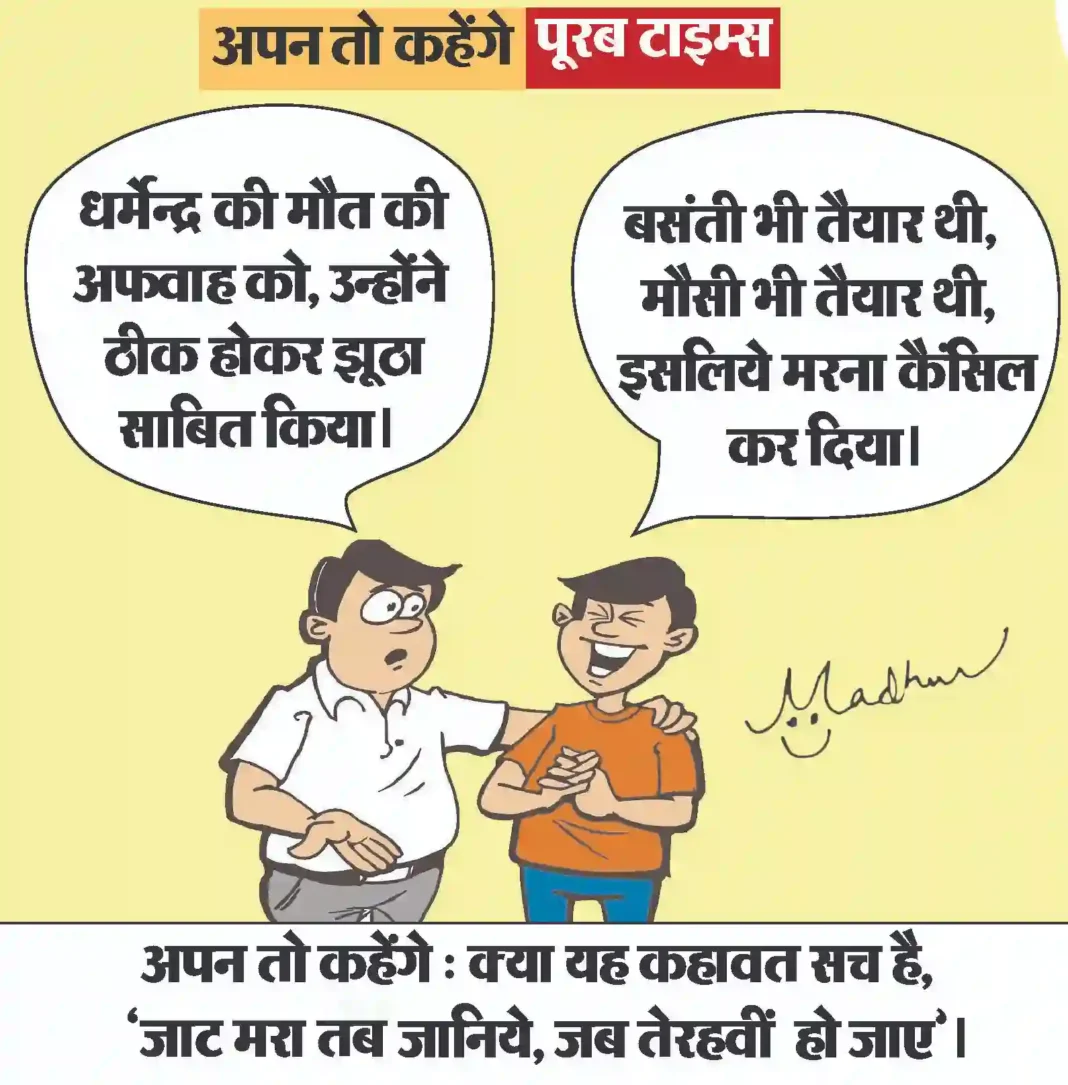 आज का कार्टून Less than 1 min.Read आज का कार्टून : क्या यह कहावत सच है, ‘जाट मरा तब जानिये, जब तेरहवीँ हो जाए’ । By Poorab Times November 13, 2025 Share FacebookTwitterPinterestWhatsApp More Topics छत्तीसगढ़ आज का कार्टून : केवल चुनाव जीतने वाले को ही योग्य मानना ज़रूरी नहीं, पढ़े-लिखे भी योग्य हो सकते हैं. 0 छत्तीसगढ़ क्या राधिका नगर, भिलाई के कसाईखाने की घपलेबाजी उजागर होगी ? 0 क्षेत्रीय अधिकारी छत्तीसगढ़ पर्यावरण संरक्षण मंडल भिलाई को जवाबदेही... मधुर वचन अब केवल महिलाएं ज़्यादा नहीं बल्कि सभी बराबर अनसेफ हैं. 0 इस बीते साल में अनेक पत्नियों ने अपने पतियों... छत्तीसगढ़ छत्तीसगढ़ क्रांति सेना के प्रदेश अध्यक्ष अमित बघेल गिरफ्तार,26 दिनों से फरार थे 0 रायपुर. छत्तीसगढ़ क्रांति सेना के प्रदेश अध्यक्ष अमित बघेल... छत्तीसगढ़ कांग्रेस के नवनियुक्त जिलाध्यक्षों की बैठक,कई वरिष्ठ नेता होंगे शामिल 0 रायपुर। छत्तीसगढ़ कांग्रेस के नवनियुक्त 41 जिलाध्यक्षों की महत्वपूर्ण... छत्तीसगढ़ बस्तर में शांति और विकास की नई इबारत 0 नक्सल प्रभावित इलाकों में वानिकी कार्य बना रोजगार का... छत्तीसगढ़ राज्यपाल श्री डेका से छत्तीसगढ़ दिव्यांगजन, वित्त एवं विकास निगम के अध्यक्ष श्री कावड़िया ने की भेंट 0 रायपुर। राज्यपाल रमेन डेका से आज यहां लोकभवन में... छत्तीसगढ़ महिला समूह की सदस्य के परिजन को पीएम जीवन ज्योति बीमा योजना से मिला दो लाख रुपये का लाभ 0 कठिन समय में बना मजबूत सहारा रायपुर। ग्रामीण महिलाओं की... इसे भी पढ़े आज का कार्टून : अमरीका ने पाकिस्तान को सेट किया तो रूस का भारत से दोस्ती निभाना जरूरी हो गया। आज का कार्टून December 5, 2025 आज का कार्टून : देश के जिम्मेदार नागरिक बने | Special Intensive Revision (SIR) में अपना वोटर आईडी वैरिफाई करायें (जनहित में जारी) आज का कार्टून December 3, 2025 आज का कार्टून : जनता यह समझ नहीं पा रही है कि क्या संसद को अखाड़ा बनाने उन्होंने पक्ष विपक्ष के सांसद चुने ? आज का कार्टून December 3, 2025 आज का कार्टून : कांग्रेसी सांसद रेणुका चौधरी अपने पालतू कुत्ते को लेकर संसद आई। कल कोई सांसद अपने पालतू गधे या सांड को... आज का कार्टून December 1, 2025 आज का कार्टून : आपको किसने रोका है ? यदि ट्रेन से सफर नहीं जमता है तो बस से या हवाई जहाज से सफर... आज का कार्टून November 30, 2025 आज का कार्टून : सैंया भये कोतवाल अब डर काहे का आज का कार्टून November 29, 2025 आज का कार्टून : अपने साथी को रावण बोलने से अपना वर्चस्व बढ़ने की जगह, साथ छूट सकता है। आज का कार्टून November 28, 2025 आज का कार्टून : कड़ाके की ठंड, गर्म कपड़ों का आनंद, बहती नाक व खरखराते गले डॉक्टर को आनंद # अपना खयाल रखें आज का कार्टून November 23, 2025 आज का कार्टून : केवल विरोध से ही नहीं बल्कि देश हित के विज़न से जनता प्रभावित होती है #RahulGandhi आज का कार्टून November 22, 2025