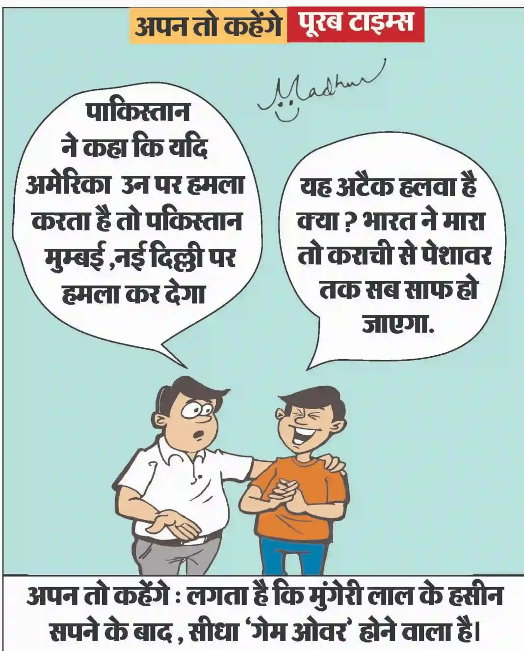 आज का कार्टून Less than 1 min.Read आज का कार्टून : लगता है कि मुंगेरी लाल के हसीन सपने के बाद , सीधा ‘गेम ओवर’ होने वाला है। By Poorab Times March 23, 2026 Share FacebookTwitterPinterestWhatsApp More Topics व्यंग्य : गुस्ताखी माफ़ अब ईरान में कमांडरों को ‘मीटिंग’ का बुलावा आना, यमराज द्वारा फ्रेंड-रिक्वेस्ट भेजे जाने जैसा है 0 डोनाल्ड ट्रंप के लिए, इरान पर यह हमला किसी... व्यंग्य : गुस्ताखी माफ़ अपने आस्तीन में पाले हुए सांपों को अब पाकिस्तान ने ‘मेड इन इंडिया’ बताने का विलाप शुरू किया 0 हमने कहानियों में पढ़ा था कि भस्मासुर को वरदान... व्यंग्य : गुस्ताखी माफ़ बरी हुए केजरीवाल व सिसोदिया : एक फाइल बंद हुई तो क्या, अलमारी में अभी और ‘इन्वेस्टिगेशन’ के भूत बाकी हैं. 0 विपक्ष को लगता है कि एक केस गिर गया... व्यंग्य : गुस्ताखी माफ़ केरल के केरलम बनते ही : नाम बदलने की ऐसी है होड़, कहीं जीपीएस न तोड़ दे अपना दम और मरोड़ 0 केंद्र सरकार ने राज्य का नाम आधिकारिक तौर पर... मनोरंजन Happy Birthday – जिद्दी और आत्मविश्वासी कंगना रनौत अपनी मेहनत से बनी बॉलीवुड की queen 0 बॉलीवुड अभिनेत्री कंगना रनौत आज यानी की 23 मार्च... देश 2027 यूपी चुनाव :अखिलेश यादव ने महिलाओं को 40,000 रुपये सालाना पेंशन का वादा किया 0 समाजवादी पार्टी के प्रमुख अखिलेश यादव ने कहा कि... महिला जगत नवरात्रि व्रत में भी खा सकते है समा चावल का हेल्दी और स्वादिष्ट उपमा 0 नवरात्रि व्रत में साबूदाना और कुट्टू से हटकर कुछ... छत्तीसगढ़ बस्तर में जनगणना 2027 : कलेक्टर आकाश छिकारा ने फील्ड ट्रेनर्स को दिया निष्ठा से कार्य करने का मंत्र 0 जगदलपुर। भारत की आगामी जनगणना 2027 के प्रथम चरण... इसे भी पढ़े आज का कार्टून : आजकल आँसू पोंछने वाले कम, और रील पर ‘हार्ट इमोजी’ भेजने वाले ज्यादा हैं 💔😊 आज का कार्टून March 22, 2026 आज का कार्टून : अब केवल कंपनी के मालिक ही नहीं, नौकरी के लिये आने वाले उम्मीदवार भी अपनी शर्तें रखेंगे . आज का कार्टून March 19, 2026 आज का कार्टून : ताजी हवा का नया पता: अब फेफड़ों में नहीं, फोन के फोल्डर में 😃 आज का कार्टून March 17, 2026 आज का कार्टून : चुनाव की घोषणा के बाद पार्टी बदलना तो बहाना है, असली मकसद तो मलाई खाना है आज का कार्टून March 16, 2026 आज का कार्टून : पेट्रोल के दाम फिर बढ़ गए, कोई बिजिऩस गुरु बताए कि इस खर्च को इंवेस्टमेंट में कैसे बदलें आज का कार्टून March 15, 2026 आज का कार्टून : रायपुर नगर निगम का अनोखा ‘स्पीड ब्रेकर’ , जो चलता भी है, सींग भी मारता है और टैक्स भी नहीं... आज का कार्टून March 14, 2026 आज का कार्टून : बिजली विभाग ने ईजाद किया “स्मार्ट मीटर” जो करंट लगने से पहले ही सदमा दे दे। आज का कार्टून March 13, 2026 आज का कार्टून : ईरान युद्ध का गहरा असर, भारत की शादियों पर भी पड़ा 😃 आज का कार्टून March 12, 2026 आज का कार्टून : बीमारी का शेड्यूल : सर, मेरी तबीयत खराब होने का ‘टाइम टेबल’ बीसीसीआई ने जा