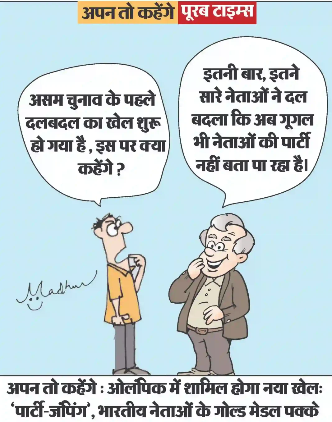 आज का कार्टून Less than 1 min.Read आज का कार्टून : ओलंपिक में शामिल होगा नया खेल: ‘पार्टी-जंपिंग’, भारतीय नेताओं के गोल्ड मेडल पक्के By Poorab Times February 20, 2026 Share FacebookTwitterPinterestWhatsApp More Topics आज का कार्टून आज का कार्टून : क्या किसी ने चुनाव आयोग के ‘आचार संहिता’ का डंडा, पक्ष या विपक्ष के किसी बड़े नेता पर चलते देखा... 0 व्यंग्य : गुस्ताखी माफ़ नई कहानी : चतुराई एक कला है लेकिन राजनीति एक जादू 0 कछुए और खरगोश की कहानी हम बचपन से सुनते... बीमारी और इलाज गोरक्षासन: एकाग्रता की कमी, कमर दर्द और कई शारीरिक समस्याओ से राहत देगा यह आसन 0 आज की भागदौड़ भरी और अनियमित जीवनशैली न केवल... महिला जगत त्योहार पर घर में बनाएं खट्टा-तीखा कांजी वड़ा पानी, जानें रेसिपी 0 होली का त्योहार नजदीक है और इस खास मौके... छत्तीसगढ़ अमित शाह के नेतृत्व में छत्तीसगढ़ से नक्सलियों का हुआ सफाया- गृहमंत्री विजय शर्मा 0 कवर्धा। उप मुख्यमंत्री व गृहमंत्री विजय शर्मा ने पूर्व... छत्तीसगढ़ श्रम विभाग की कल्याणकारी योजनाओं का अधिक से अधिक लाभ लेने श्रमिक भाई -बहन बनें जागरूक- राजस्व मंत्री श्री वर्मा 0 -श्रमिकों के आर्थिक और सामाजिक विकास के लिए नवीन... छत्तीसगढ़ डिजिटल सुविधा केंद्र में 86 वर्षीय भक्तिन राय को अंगूठे के निशान पर मिल रही सुविधाएं 0 राजानवागांव में डिजिटल सेवा से बदली जिंदगीबैंक की कतारों... छत्तीसगढ़ सीएचएमओ एवं नगर निगम बिलासपुर प्रश्नांकित हुए…फर्जी जन्म प्रमाण पत्र बनाने का मामले ने तूल पकड़ा! 0 माता की पहचान सुनिश्चित किये बिना बच्चे का जन्म... इसे भी पढ़े आज का कार्टून : क्या किसी ने चुनाव आयोग के ‘आचार संहिता’ का डंडा, पक्ष या विपक्ष के किसी बड़े नेता पर चलते देखा... आज का कार्टून February 20, 2026 आज का कार्टून : ‘त्याग’ सिर्फ चुनाव घोषणापत्रों में होता है, बैंक अकाउंट में तो सिर्फ ‘क्रेडिट’ का मैसेज ही सुहाता है। आज का कार्टून February 18, 2026 आज का कार्टून : ट्रम्प व खोमनेई, एक दूसरे को इतनी ज़ोर ज़ोर से ललकार रहे हैं कि देखने वाले , बाकी विश्व का... आज का कार्टून February 17, 2026 आज का कार्टून : ज़ेन–ज़ी वो पीढ़ी है जो ‘पुराना बॉयफ्रेंड’ छोड़ तो देती है, पर फिर ‘पुरानी यादों’ के चक्कर में पुराने खानदान... आज का कार्टून February 16, 2026 आज का कार्टून : केवल निमंत्रण से बात नहीं बनेगी. दोस्ती करने के लिए बांग्लादेश को और कोशिश करनी होगी आज का कार्टून February 15, 2026 आज का कार्टून : जो बच्चा रात भर रील देख सकता है , बस, उसे अपनी ‘स्क्रॉलिंग’ वाली उंगली को ‘राइटिंग’ में बदलना है! आज का कार्टून February 13, 2026 आज का कॉर्टून : इस केस से पता चला कि “बिन मांगे मोती मिले, मांगे मिले ना भीख” क्या होता है. आज का कार्टून February 11, 2026 आज का कार्टून : धनखड़ जी की राह पर बिरला जी : सत्ता पक्ष उन्हें बचा तो लेगा पर उस ‘झुकाव’ का क्या जो... आज का का
