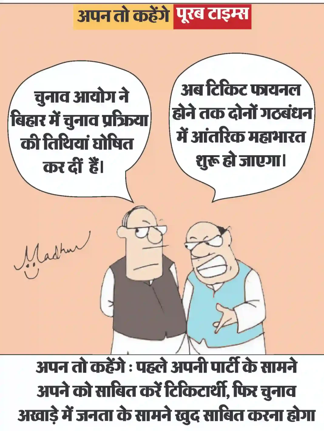 आज का कार्टून Less than 1 min.Read आज का कार्टून : पहले अपनी पार्टी के सामने अपने को साबित करें टिकिटार्थी, फिर चुनाव अखाड़े में जनता के सामने खुद साबित करना होगा By Poorab Times October 6, 2025 Share FacebookTwitterPinterestWhatsApp More Topics आज का कार्टून आज का कार्टून : ईरान युद्ध का गहरा असर, भारत की शादियों पर भी पड़ा 😃 0 छत्तीसगढ़ प्रशिक्षु न्यायाधीश लोकतंत्र के तीसरे स्तंभ के रूप में निभाएंगे महत्वपूर्ण भूमिका : मुख्यमंत्री श्री साय 0 रायपुर। मुख्यमंत्री विष्णु देव साय से आज विधानसभा स्थित... देश बिहार भर्ती बोर्ड की गंभीर लापरवाही ,एडमिट कार्ड पर पर कुत्ते की फोटो 0 बिहार के रोहतास में भर्ती परीक्षा प्रणाली की गंभीर... छत्तीसगढ़ बिहान से बदली महिलाओं की जिंदगी, आर्थिक सशक्तिकरण की राह पर बढ़ रहीं ‘लखपति दीदी’ 0 महतारी वंदन योजना और बिहान से मिली नई पहचान रायपुर।... छत्तीसगढ़ साझी मेहनत, साझा समृद्धि — ‘बिहान’ से बदल रहा ग्रामीण महिला जीवन 0 धमतरी। राष्ट्रीय ग्रामीण आजीविका मिशन के अंतर्गत संचालित छत्तीसगढ़... छत्तीसगढ़ 10,000 चूजों की क्षमता वाले एयर कंडीशनर मुर्गी फार्म का संचालन कर रही है माँ लक्ष्मी महिला समूह 0 मुर्गी फार्म से लगभग 80 हजार से अधिक का... देश धामी सरकार ने हरिद्वार कुंभ मेला 2027 के लिए 1000 करोड़ किये आवंटित 0 आध्यात्मिक पर्यटन को बढ़ावा देने और राज्य के धार्मिक... छत्तीसगढ़ खेल प्रतियोगिताओं के साथ उत्साहपूर्वक मनाया गया अंतरराष्ट्रीय महिला दिवस, महिलाओं ने दिखाया दमखम 0 एमसीबी. अंतरराष्ट्रीय महिला दिवस के अवसर पर जिला प्रशासन... इसे भी पढ़े आज का कार्टून : ईरान युद्ध का गहरा असर, भारत की शादियों पर भी पड़ा 😃 आज का कार्टून March 12, 2026 आज का कार्टून : बीमारी का शेड्यूल : सर, मेरी तबीयत खराब होने का ‘टाइम टेबल’ बीसीसीआई ने जारी कर दिया है . #... आज का कार्टून March 11, 2026 आज का कार्टून : सड़क पर अंदोलन के लिये भारत में राजनीतिक पार्टियों को भी भाड़े पर कार्यकर्ता इकट्ठे करने पड़ते हैं, हमारा जेन... आज का कार्टून March 10, 2026 आज का कार्टून : जो परमाणु हथियार उपयोग की कोशिश भी करेगा, पूरा विश्व उसके विरुद्ध खड़ा हो जायेगा आज का कार्टून March 8, 2026 आज का कार्टून : आंध्र प्रदेश सरकार ने ‘डिजिटल ब्रेक’ लगा दिया है, अब 13 से कम उम्र वाले सोशल मीडिया से आउट होंगे आज का कार्टून March 7, 2026 आज का कार्टून : क्या कहते हैं युद्ध रोकने के लिये ठंडाई के नशे में डूबे, ब्रह्मांड के सबसे बड़ा एक्सपर्ट आज का कार्टून March 3, 2026 आज का कार्टून : पाकिस्तान क्रिकेट बोर्ड का नया मंत्र: “जीतो या घर की रजिस्ट्री लाओ” आज का कार्टून March 2, 2026 आज का कार्टून : पिचकारी से रंग व गोल गुब्बारा, लगाओ सीधा अंकल के पेट पर निशाना और बोलो ‘बुरा न मानो होली है’ आज का कार्टून March 1, 2026 आज का कार्टून : महाशक्तियों की म्यूजिकल चेयर रेस 