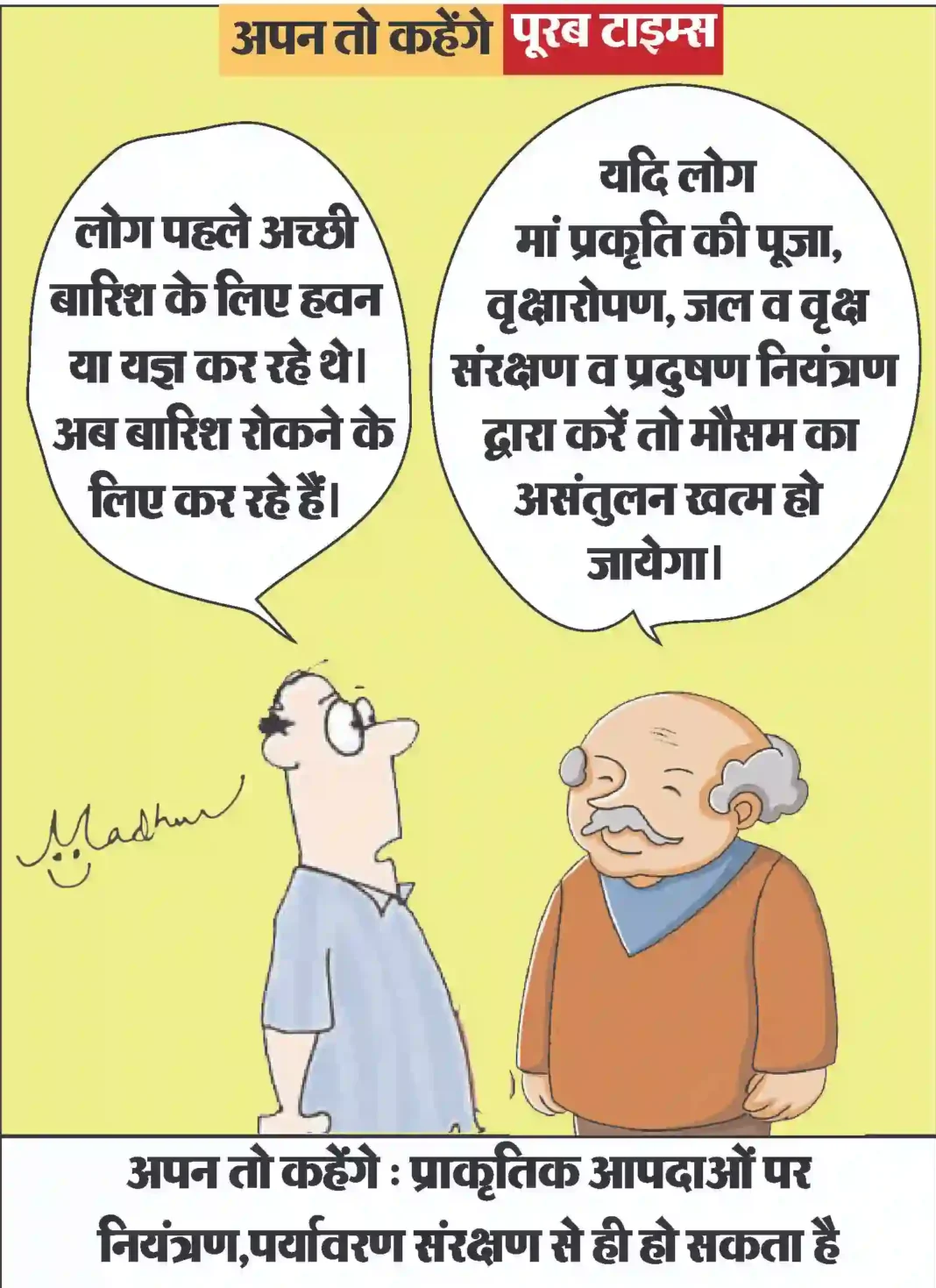 आज का कार्टून Less than 1 min.Read आज का कार्टून : प्राकृतिक आपदाओं पर नियंत्रण,पर्यावरण संरक्षण से ही हो सकता है By Poorab Times September 24, 2025 Share FacebookTwitterPinterestWhatsApp More Topics आज का कार्टून आज का कार्टून : ईरान युद्ध का गहरा असर, भारत की शादियों पर भी पड़ा 😃 0 छत्तीसगढ़ प्रशिक्षु न्यायाधीश लोकतंत्र के तीसरे स्तंभ के रूप में निभाएंगे महत्वपूर्ण भूमिका : मुख्यमंत्री श्री साय 0 रायपुर। मुख्यमंत्री विष्णु देव साय से आज विधानसभा स्थित... देश बिहार भर्ती बोर्ड की गंभीर लापरवाही ,एडमिट कार्ड पर पर कुत्ते की फोटो 0 बिहार के रोहतास में भर्ती परीक्षा प्रणाली की गंभीर... छत्तीसगढ़ बिहान से बदली महिलाओं की जिंदगी, आर्थिक सशक्तिकरण की राह पर बढ़ रहीं ‘लखपति दीदी’ 0 महतारी वंदन योजना और बिहान से मिली नई पहचान रायपुर।... छत्तीसगढ़ साझी मेहनत, साझा समृद्धि — ‘बिहान’ से बदल रहा ग्रामीण महिला जीवन 0 धमतरी। राष्ट्रीय ग्रामीण आजीविका मिशन के अंतर्गत संचालित छत्तीसगढ़... छत्तीसगढ़ 10,000 चूजों की क्षमता वाले एयर कंडीशनर मुर्गी फार्म का संचालन कर रही है माँ लक्ष्मी महिला समूह 0 मुर्गी फार्म से लगभग 80 हजार से अधिक का... देश धामी सरकार ने हरिद्वार कुंभ मेला 2027 के लिए 1000 करोड़ किये आवंटित 0 आध्यात्मिक पर्यटन को बढ़ावा देने और राज्य के धार्मिक... छत्तीसगढ़ खेल प्रतियोगिताओं के साथ उत्साहपूर्वक मनाया गया अंतरराष्ट्रीय महिला दिवस, महिलाओं ने दिखाया दमखम 0 एमसीबी. अंतरराष्ट्रीय महिला दिवस के अवसर पर जिला प्रशासन... इसे भी पढ़े आज का कार्टून : ईरान युद्ध का गहरा असर, भारत की शादियों पर भी पड़ा 😃 आज का कार्टून March 12, 2026 आज का कार्टून : बीमारी का शेड्यूल : सर, मेरी तबीयत खराब होने का ‘टाइम टेबल’ बीसीसीआई ने जारी कर दिया है . #... आज का कार्टून March 11, 2026 आज का कार्टून : सड़क पर अंदोलन के लिये भारत में राजनीतिक पार्टियों को भी भाड़े पर कार्यकर्ता इकट्ठे करने पड़ते हैं, हमारा जेन... आज का कार्टून March 10, 2026 आज का कार्टून : जो परमाणु हथियार उपयोग की कोशिश भी करेगा, पूरा विश्व उसके विरुद्ध खड़ा हो जायेगा आज का कार्टून March 8, 2026 आज का कार्टून : आंध्र प्रदेश सरकार ने ‘डिजिटल ब्रेक’ लगा दिया है, अब 13 से कम उम्र वाले सोशल मीडिया से आउट होंगे आज का कार्टून March 7, 2026 आज का कार्टून : क्या कहते हैं युद्ध रोकने के लिये ठंडाई के नशे में डूबे, ब्रह्मांड के सबसे बड़ा एक्सपर्ट आज का कार्टून March 3, 2026 आज का कार्टून : पाकिस्तान क्रिकेट बोर्ड का नया मंत्र: “जीतो या घर की रजिस्ट्री लाओ” आज का कार्टून March 2, 2026 आज का कार्टून : पिचकारी से रंग व गोल गुब्बारा, लगाओ सीधा अंकल के पेट पर निशाना और बोलो ‘बुरा न मानो होली है’ आज का कार्टून March 1, 2026 आज का कार्टून : महाशक्तियों की म्यूजिकल चेयर रेस में क्या रूस-चीन की ईरान युद्ध में ‘बैकडोर’ एं