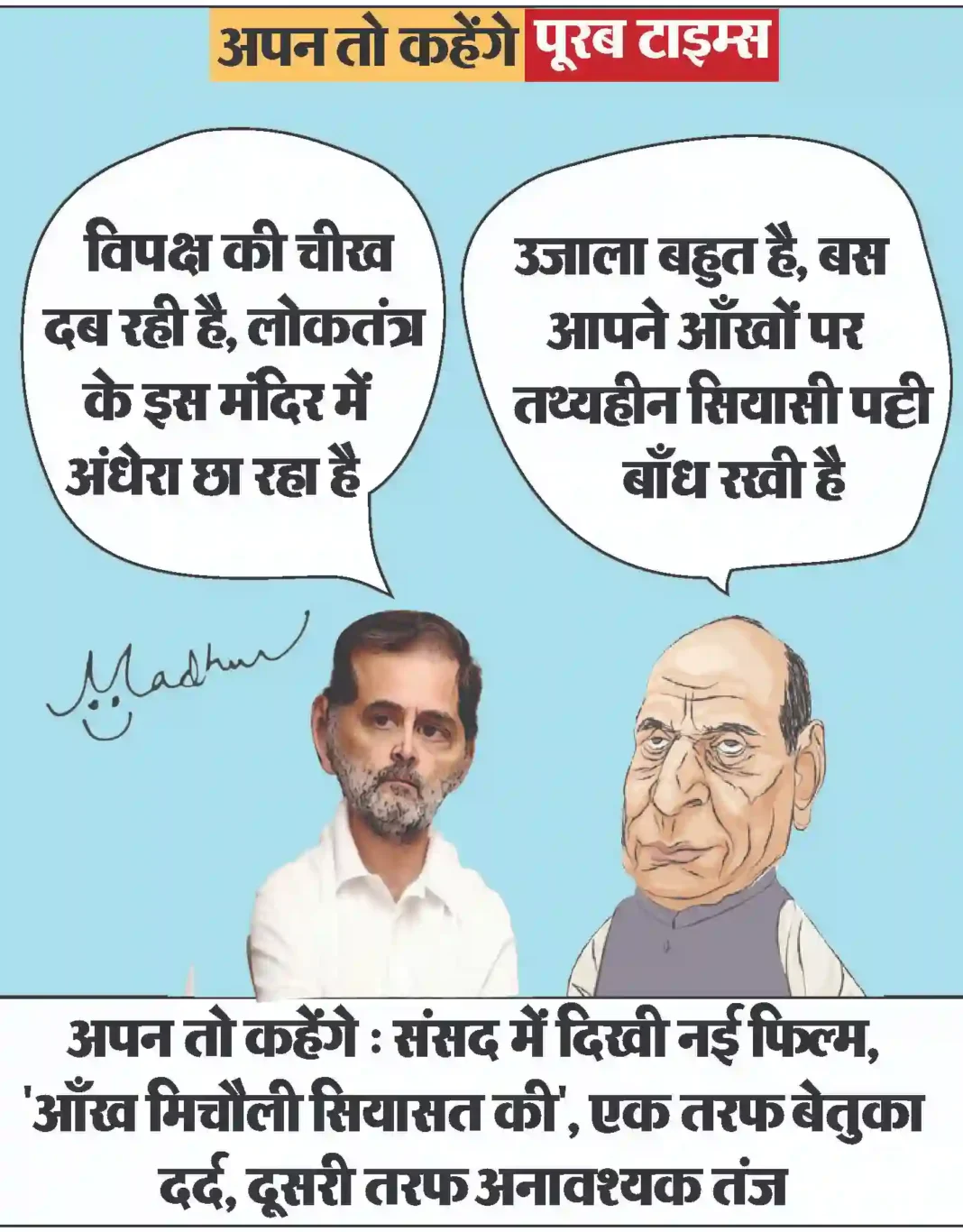 आज का कार्टून Less than 1 min.Read आज का कार्टून : संसद में दिखी नई फिल्म , “आँख मिचौली सियासत की” , एक तरफ बेतुका दर्द , दूसरी तरफ अनावश्यक तंज By Poorab Times February 5, 2026 Share FacebookTwitterPinterestWhatsApp More Topics व्यंग्य : गुस्ताखी माफ़ इस खेल में सत्ता पक्ष कितनी भी ‘गलतियों’ पर उतर आए , विपक्ष फिर भी ‘सेल्फ गोल’ खायेगा ? 0 आजकल बीजेपी TINA फैक्टर यानी देयर इस नो आल्टरनेटिव... आज का कार्टून आज का कार्टून : जिनके खुद के घर शीशे के रहते हैं , उन्हें दूसरों को जबरन उंगली नहीं करना चाहिये 0 छत्तीसगढ़ जनजातीय परंपराओं और संस्कृति पर आधारित भव्य प्रदर्शनी का राष्ट्रपति द्रौपदी मुर्मु ने किया अवलोकन 0 बस्तर पंडुम के शुभारंभ समारोह में शामिल होने पहुंचीं... छत्तीसगढ़ रेरा प्रावधानों के प्रभावी क्रियान्वयन की दिशा में छत्तीसगढ़ रेरा का महत्वपूर्ण कदम, 14 बैंकों को फाइनल एम्पैनलमेंट किया गया 0 छत्तीसगढ़ रियल एस्टेट विनियामक प्राधिकरण ने राज्य में रियल... पर्यटन और संस्कृति अरावली हिल्स की ये 3 जगहें है इतिहास और रोमांच से भरपूर 0 कुछ समय पहले अरावली हिल्स पर चल रहे विवादों... महिला जगत यदि सफेद की जगह पीला डैंड्रफ दिखे तो हो सकता है ये गंभीर रोग, जरूर कराएं ये टेस्ट 0 अगर आप भी सिर में लगातार होने वाली खुजली... वनस्पति जड़ी बूटी देसी नुस्खे हल्दी का पाउडर ही नहीं, इसके पत्ते भी हैं सेहत का खजाना, जानें कैसे 0 हम सभी हल्दी की पाउडर या गांठ से अच्छी... छत्तीसगढ़ राष्ट्रपति द्रौपदी मुर्मू का जगदलपुर के मां दंतेश्वरी एयरपोर्ट में आत्मीय स्वागत 0 देश की राष्ट्रपति द्रौपदी मुर्मू का आज बस्तर संभाग... इसे भी पढ़े आज का कार्टून : जिनके खुद के घर शीशे के रहते हैं , उन्हें दूसरों को जबरन उंगली नहीं करना चाहिये आज का कार्टून February 7, 2026 आज का कार्टून : राज्य सभा का टिकट पक्का होने से पहले, घोटाले की फाइल पर ‘सफेद सफेदी’ का पक्का इंतजाम तो होगा ही... आज का कार्टून February 5, 2026 आज का कार्टून : दूसरे का घर जलाने चले थे, खुद की लुंगी में आग लग रही है. बांग्लादेश को भड़काना अलग बात है... आज का कार्टून February 4, 2026 आज का कार्टून : पर्यावरण विभाग का सबसे बड़ा योगदान, हर साल प्रदूषण बढ़ने पर ‘चिंता’ व्यक्त करने का रिकॉर्ड बनाना है आज का कार्टून February 2, 2026 आज का कार्टून : बजट उतना ही समझ आया है , जितना मोंटेसरी के बच्चे को रॉकेट साइंस . आंकड़ों के जाल में कैल्कुलेटर... आज का कार्टून February 1, 2026 आज का कार्टून : सोना क्या सस्ता हुआ, शादी लायक लड़कियों के पिता व मोहल्ले के कुंवारे लड़कों के चेहरे पर ‘गोल्डन ग्लो’ लौट... आज का कार्टून January 31, 2026 आज का कार्टून : अब पूरे देश की आशावादी नज़र इस बार के बजट पर…. आज का कार्टून January 31, 2026 आज का कार्टून : आज की राशि फल की तर्ज पर “ट्रम्प टैरिफ फल” देखे बिना निवेश करना जेब की सेहत के लिये जोखिम... आज