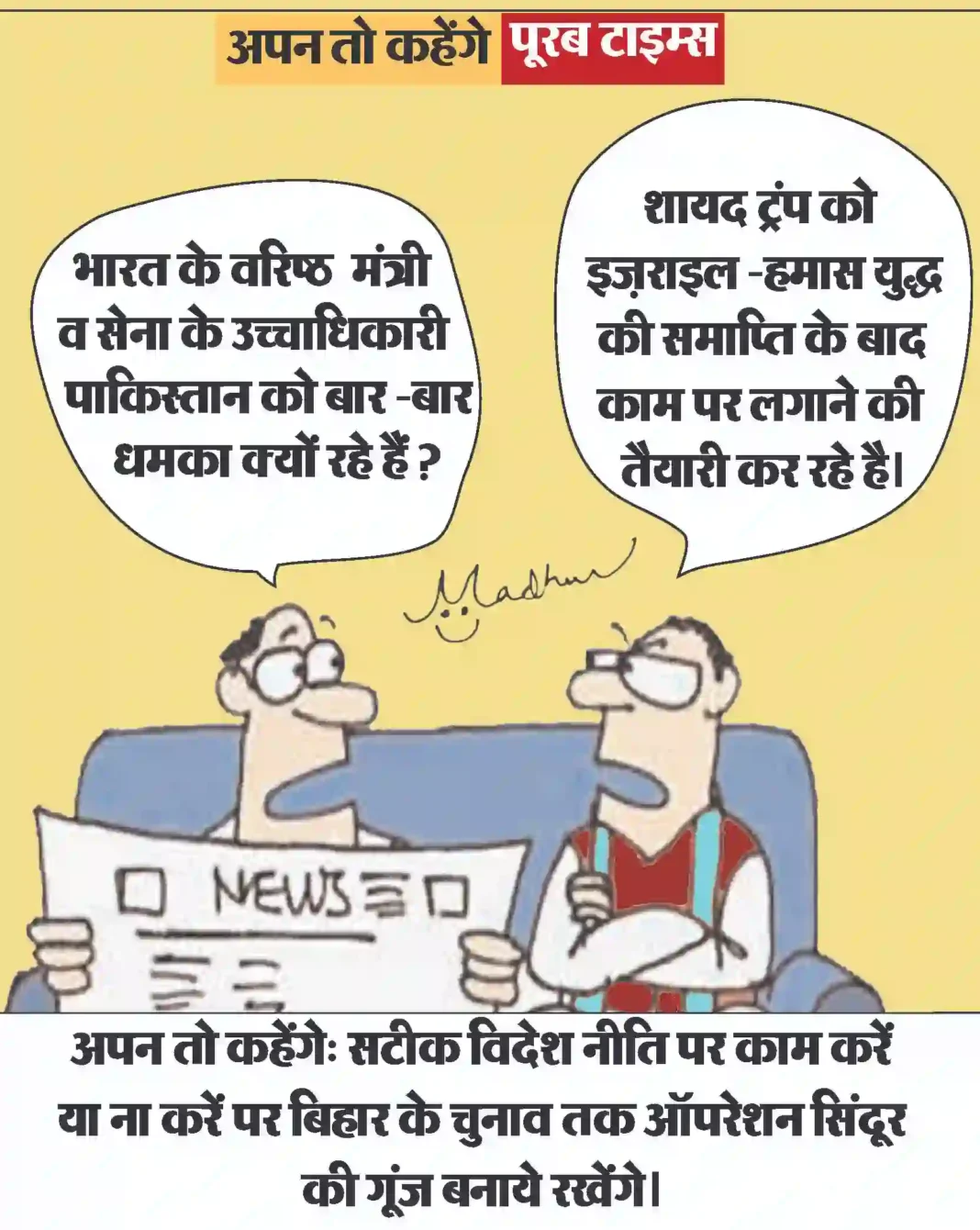 आज का कार्टून Less than 1 min.Read आज का कार्टून : सटीक विदेश नीति पर काम करें या ना करें पर बिहार के चुनाव तक ऑपरेशन सिंदूर की गूंज बनाये रखेंगे। By Poorab Times October 4, 2025 Share FacebookTwitterPinterestWhatsApp More Topics आज का कार्टून आज का कार्टून : ईरान युद्ध का गहरा असर, भारत की शादियों पर भी पड़ा 😃 0 छत्तीसगढ़ प्रशिक्षु न्यायाधीश लोकतंत्र के तीसरे स्तंभ के रूप में निभाएंगे महत्वपूर्ण भूमिका : मुख्यमंत्री श्री साय 0 रायपुर। मुख्यमंत्री विष्णु देव साय से आज विधानसभा स्थित... देश बिहार भर्ती बोर्ड की गंभीर लापरवाही ,एडमिट कार्ड पर पर कुत्ते की फोटो 0 बिहार के रोहतास में भर्ती परीक्षा प्रणाली की गंभीर... छत्तीसगढ़ बिहान से बदली महिलाओं की जिंदगी, आर्थिक सशक्तिकरण की राह पर बढ़ रहीं ‘लखपति दीदी’ 0 महतारी वंदन योजना और बिहान से मिली नई पहचान रायपुर।... छत्तीसगढ़ साझी मेहनत, साझा समृद्धि — ‘बिहान’ से बदल रहा ग्रामीण महिला जीवन 0 धमतरी। राष्ट्रीय ग्रामीण आजीविका मिशन के अंतर्गत संचालित छत्तीसगढ़... छत्तीसगढ़ 10,000 चूजों की क्षमता वाले एयर कंडीशनर मुर्गी फार्म का संचालन कर रही है माँ लक्ष्मी महिला समूह 0 मुर्गी फार्म से लगभग 80 हजार से अधिक का... देश धामी सरकार ने हरिद्वार कुंभ मेला 2027 के लिए 1000 करोड़ किये आवंटित 0 आध्यात्मिक पर्यटन को बढ़ावा देने और राज्य के धार्मिक... छत्तीसगढ़ खेल प्रतियोगिताओं के साथ उत्साहपूर्वक मनाया गया अंतरराष्ट्रीय महिला दिवस, महिलाओं ने दिखाया दमखम 0 एमसीबी. अंतरराष्ट्रीय महिला दिवस के अवसर पर जिला प्रशासन... इसे भी पढ़े आज का कार्टून : ईरान युद्ध का गहरा असर, भारत की शादियों पर भी पड़ा 😃 आज का कार्टून March 12, 2026 आज का कार्टून : बीमारी का शेड्यूल : सर, मेरी तबीयत खराब होने का ‘टाइम टेबल’ बीसीसीआई ने जारी कर दिया है . #... आज का कार्टून March 11, 2026 आज का कार्टून : सड़क पर अंदोलन के लिये भारत में राजनीतिक पार्टियों को भी भाड़े पर कार्यकर्ता इकट्ठे करने पड़ते हैं, हमारा जेन... आज का कार्टून March 10, 2026 आज का कार्टून : जो परमाणु हथियार उपयोग की कोशिश भी करेगा, पूरा विश्व उसके विरुद्ध खड़ा हो जायेगा आज का कार्टून March 8, 2026 आज का कार्टून : आंध्र प्रदेश सरकार ने ‘डिजिटल ब्रेक’ लगा दिया है, अब 13 से कम उम्र वाले सोशल मीडिया से आउट होंगे आज का कार्टून March 7, 2026 आज का कार्टून : क्या कहते हैं युद्ध रोकने के लिये ठंडाई के नशे में डूबे, ब्रह्मांड के सबसे बड़ा एक्सपर्ट आज का कार्टून March 3, 2026 आज का कार्टून : पाकिस्तान क्रिकेट बोर्ड का नया मंत्र: “जीतो या घर की रजिस्ट्री लाओ” आज का कार्टून March 2, 2026 आज का कार्टून : पिचकारी से रंग व गोल गुब्बारा, लगाओ सीधा अंकल के पेट पर निशाना और बोलो ‘बुरा न मानो होली है’ आज का कार्टून March 1, 2026 आज का कार्टून : महाशक्तियों की म्यूजिकल चेयर रेस में क्या रूस-चीन 