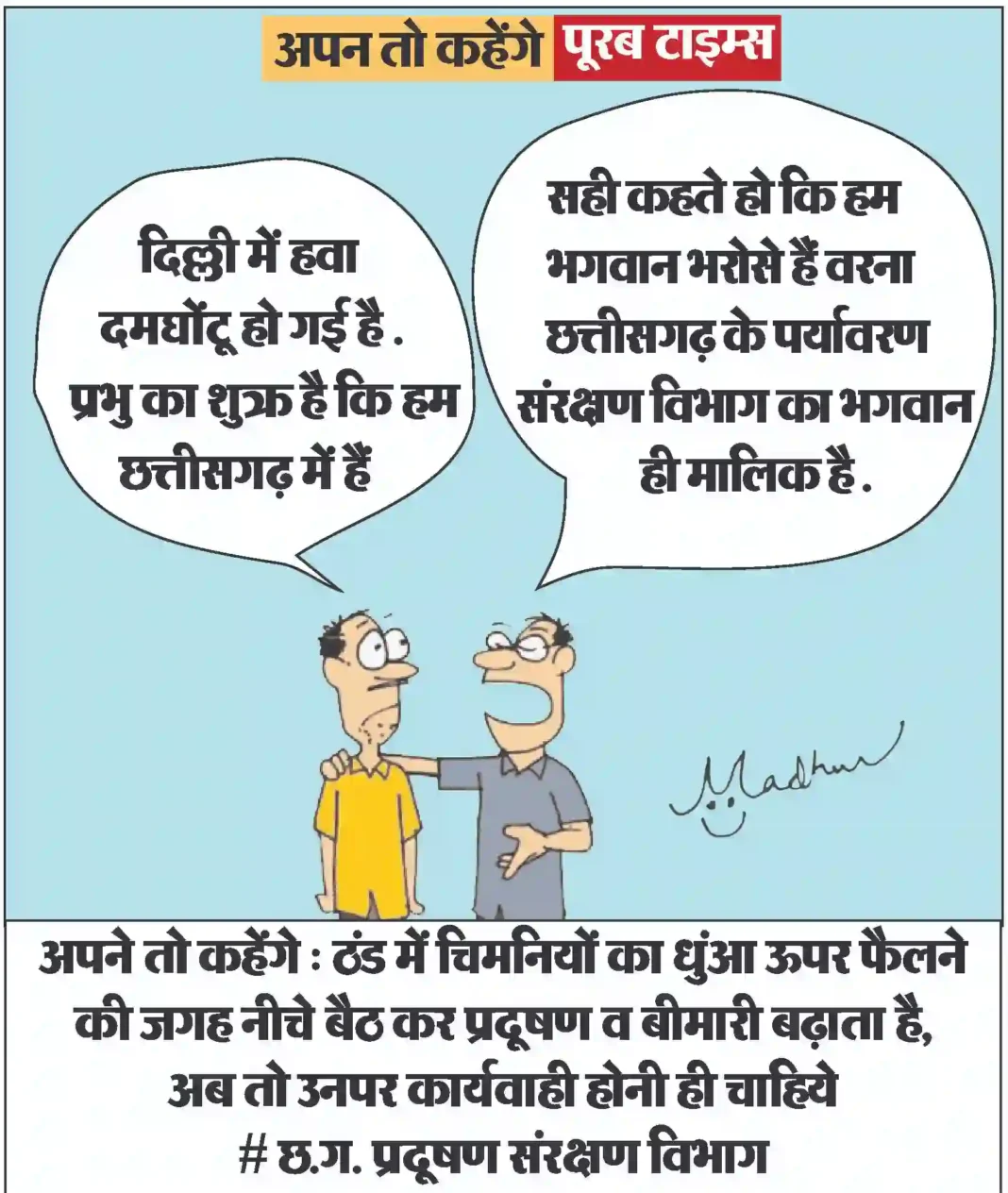 आज का कार्टून : ठंड में चिमनियों का धुंआ ऊपर फैलने की जगह नीचे बैठ कर प्रदूषण व बीमारी बढ़ाता है , अब तो उनपर कार्यवाही होनी ही चाहिये # छ.ग. प्रदूषण संरक्षण विभाग