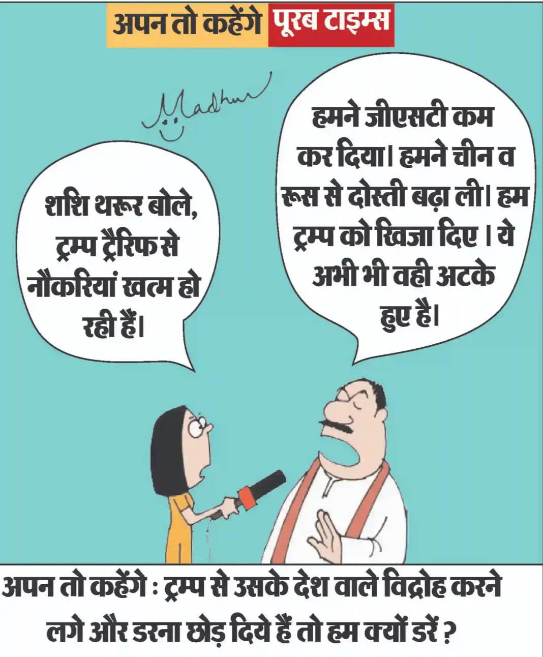 आज का कार्टून Less than 1 min.Read आज का कार्टून : ट्रम्प से उसके देश वाले विद्रोह करने लगे और डरना छोड़ दिये हैं तो हम क्यों डरें ? By Poorab Times September 14, 2025 Share FacebookTwitterPinterestWhatsApp More Topics आज का कार्टून आज का कार्टून : ईरान युद्ध का गहरा असर, भारत की शादियों पर भी पड़ा 😃 0 छत्तीसगढ़ प्रशिक्षु न्यायाधीश लोकतंत्र के तीसरे स्तंभ के रूप में निभाएंगे महत्वपूर्ण भूमिका : मुख्यमंत्री श्री साय 0 रायपुर। मुख्यमंत्री विष्णु देव साय से आज विधानसभा स्थित... देश बिहार भर्ती बोर्ड की गंभीर लापरवाही ,एडमिट कार्ड पर पर कुत्ते की फोटो 0 बिहार के रोहतास में भर्ती परीक्षा प्रणाली की गंभीर... छत्तीसगढ़ बिहान से बदली महिलाओं की जिंदगी, आर्थिक सशक्तिकरण की राह पर बढ़ रहीं ‘लखपति दीदी’ 0 महतारी वंदन योजना और बिहान से मिली नई पहचान रायपुर।... छत्तीसगढ़ साझी मेहनत, साझा समृद्धि — ‘बिहान’ से बदल रहा ग्रामीण महिला जीवन 0 धमतरी। राष्ट्रीय ग्रामीण आजीविका मिशन के अंतर्गत संचालित छत्तीसगढ़... छत्तीसगढ़ 10,000 चूजों की क्षमता वाले एयर कंडीशनर मुर्गी फार्म का संचालन कर रही है माँ लक्ष्मी महिला समूह 0 मुर्गी फार्म से लगभग 80 हजार से अधिक का... देश धामी सरकार ने हरिद्वार कुंभ मेला 2027 के लिए 1000 करोड़ किये आवंटित 0 आध्यात्मिक पर्यटन को बढ़ावा देने और राज्य के धार्मिक... छत्तीसगढ़ खेल प्रतियोगिताओं के साथ उत्साहपूर्वक मनाया गया अंतरराष्ट्रीय महिला दिवस, महिलाओं ने दिखाया दमखम 0 एमसीबी. अंतरराष्ट्रीय महिला दिवस के अवसर पर जिला प्रशासन... इसे भी पढ़े आज का कार्टून : ईरान युद्ध का गहरा असर, भारत की शादियों पर भी पड़ा 😃 आज का कार्टून March 12, 2026 आज का कार्टून : बीमारी का शेड्यूल : सर, मेरी तबीयत खराब होने का ‘टाइम टेबल’ बीसीसीआई ने जारी कर दिया है . #... आज का कार्टून March 11, 2026 आज का कार्टून : सड़क पर अंदोलन के लिये भारत में राजनीतिक पार्टियों को भी भाड़े पर कार्यकर्ता इकट्ठे करने पड़ते हैं, हमारा जेन... आज का कार्टून March 10, 2026 आज का कार्टून : जो परमाणु हथियार उपयोग की कोशिश भी करेगा, पूरा विश्व उसके विरुद्ध खड़ा हो जायेगा आज का कार्टून March 8, 2026 आज का कार्टून : आंध्र प्रदेश सरकार ने ‘डिजिटल ब्रेक’ लगा दिया है, अब 13 से कम उम्र वाले सोशल मीडिया से आउट होंगे आज का कार्टून March 7, 2026 आज का कार्टून : क्या कहते हैं युद्ध रोकने के लिये ठंडाई के नशे में डूबे, ब्रह्मांड के सबसे बड़ा एक्सपर्ट आज का कार्टून March 3, 2026 आज का कार्टून : पाकिस्तान क्रिकेट बोर्ड का नया मंत्र: “जीतो या घर की रजिस्ट्री लाओ” आज का कार्टून March 2, 2026 आज का कार्टून : पिचकारी से रंग व गोल गुब्बारा, लगाओ सीधा अंकल के पेट पर निशाना और बोलो ‘बुरा न मानो होली है’ आज का कार्टून March 1, 2026 आज का कार्टून : महाशक्तियों की म्यूजिकल चेयर रेस में क्या रूस-चीन की ईरान युद्ध 