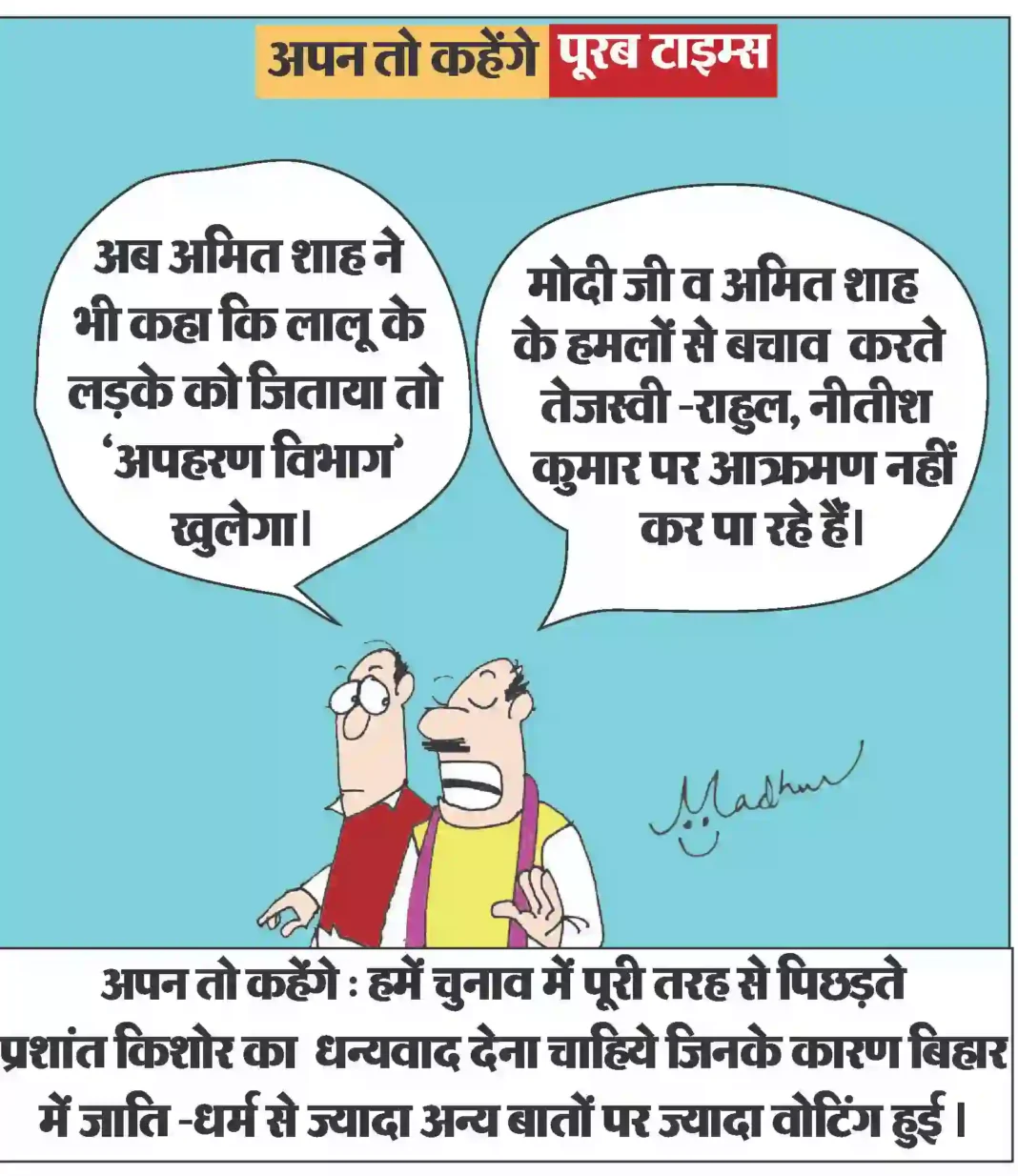 आज का कार्टून : हमें चुनाव में पूरी तरह से पिछड़ते प्रशांत किशोर का धन्यवाद देना चाहिये जिनके कारण बिहार में जाति -धर्म से ज्यादा अन्य बातों पर ज्यादा वोटिंग हुई
