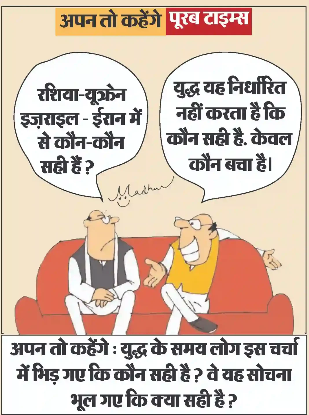 आज का कार्टून : युद्ध के समय लोग इस चर्चा में भिड़ गए कि कौन सही है ? वे यह सोचना भूल गए कि क्या सही है ?
