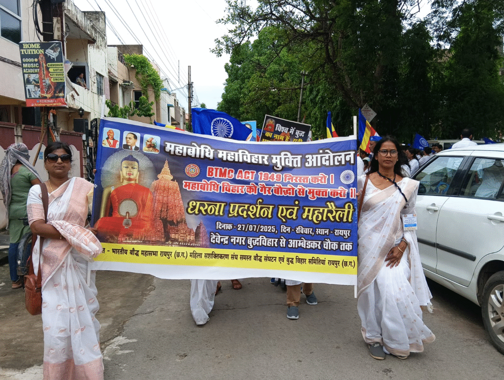 बोधगया स्थित विश्वविख्यात महाबोधि महाविहार को बौद्ध समुदाय को सौंपने की मांग को लेकर आज छत्तीसगढ़ के इतिहास में एक ऐसा दिन दर्ज हो गया, जब राजधानी रायपुर से लेकर प्रदेश के अनेक जिलों तक हजारों की भीड़ सड़कों पर उतरी और एक सुर में इस ऐतिहासिक अन्याय को खत्म करने की हुंकार भर दी। ऑल इंडिया बुद्धिस्ट फोरम के आव्हान पर तथा भारतीय बौद्ध महासभा रायपुर के नेतृत्व में निकली इस ऐतिहासिक महारैली में रायपुर में दोपहर 12 बजे देवेंद्र नगर बुद्ध विहार से जब विशाल जुलूस शुरू हुआ, तो देखते ही देखते पूरा शहर नारों, बैनरों और आस्था की लहर से गूंज उठा। इस रैली में बच्चों, बुजुर्गों, महिलाओं और युवाओं की बड़ी संख्या में मौजूदगी ने दिखा दिया कि यह आंदोलन सिर्फ कुछ लोगों की पहल नहीं, बल्कि पूरे समाज की चेतना बन चुका है।