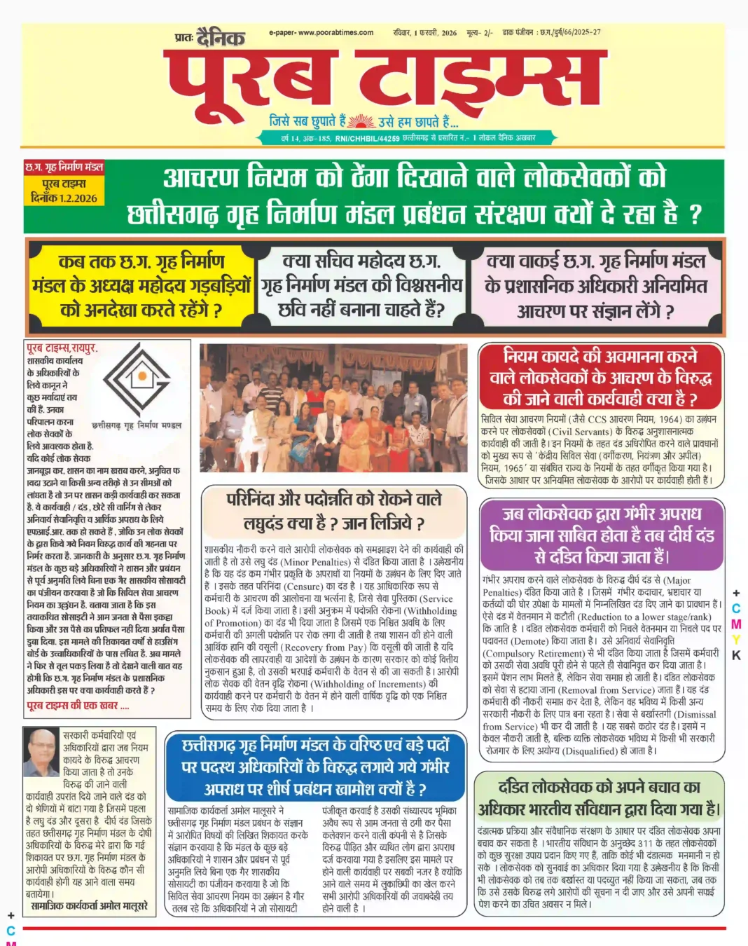 पूरब टाइम्स, रायपुर . शासकीय कार्यालय के अधिकारियों के लिये कानून ने कुछ मर्यादाएं तय कीं हैं . उनका परिपालन करना लोक सेवकों के लिये आवश्यक होता है . यदि कोई लोक सेवक जानबूझ कर , शासन का नाम खराब करने, अनुचित फायदा उठाने या किसी अन्य तरीक़े से उन सीमओं को लांघता है तो उन पर शासन कड़ी कार्यवाही कर सकता है . ये कार्यवाही / दंड , छोटे सी वार्निंग से लेकर अनिवार्य सेवानिवृत्ति व आर्थिक अपराध के लिये एफ.आई.आर. तक हो सकते हैं , जोकि उन लोक सेवकों के द्वारा किये गये नियम विरुद्ध कार्य की गहनता पर निर्भर करता है . जानकारी के अनुसार छ.ग. गृह निर्माण मंडल के कुछ बड़े अधिकारियों ने शासन और प्रबंधन से पूर्व अनुमति लिये बिना एक गैर शासकीय सोसायटी का पंजीयन करवाया है जो कि सिविल सेवा आचरण नियम का उल्लंघन है . बताया जाता है कि इस तथाकथित सोसाइटी ने आम जनता से पैसा इकट्ठा किया और उस पैसे का प्रतिफल नहीं दिया अर्थात पैसा डुबा दिया . इस मामले की शिकायत वर्षों से हाउसिंग बोर्ड के उच्चाधिकारियों के पास लंबित है . अब मामले ने फिर से तूल पकड़ लिया है तो देखने वाली बात यह होगी कि छ.ग. गृह निर्माण मंडल के प्रशासनिक अधिकारी इस पर क्या कार्यवाही करते हैं ? पूरब टाइम्स की एक खबर .