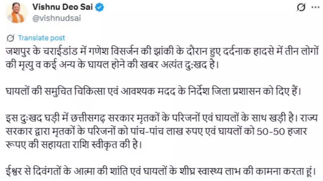 मुख्यमंत्री विष्णुदेव साय ने इस घटना पर गहरा शोक व्यक्त किया है। उन्होंने अपने X (पूर्व ट्विटर) पोस्ट में लिखा कि—