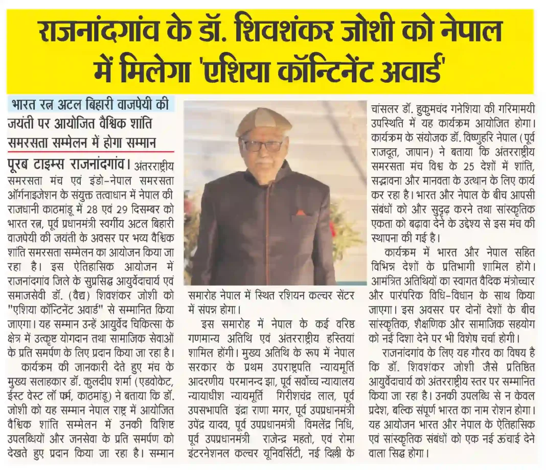पूरब टाइम्स राजनांदगांव। अंतरराष्ट्रीय समरसता मंच एवं इंडो-नेपाल समरसता ऑर्गनाइजेशन के संयुक्त तत्वाधान में नेपाल की राजधानी काठमांडू में 28 एवं 29 दिसम्बर को भारत रत्न, पूर्व प्रधानमंत्री स्वर्गीय अटल बिहारी वाजपेयी की जयंती के अवसर पर भव्य वैश्विक शांति समरसता सम्मेलन का आयोजन किया जा रहा है। इस ऐतिहासिक आयोजन में राजनांदगांव जिले के सुप्रसिद्ध आयुर्वेदाचार्य एवं समाजसेवी डॉ. (वैद्य) शिवशंकर जोशी को “एशिया कॉन्टिनेंट अवार्ड” से सम्मानित किया जाएगा। यह सम्मान उन्हें आयुर्वेद चिकित्सा के क्षेत्र में उत्कृष्ट योगदान तथा सामाजिक सेवाओं के प्रति समर्पण के लिए प्रदान किया जा रहा है।