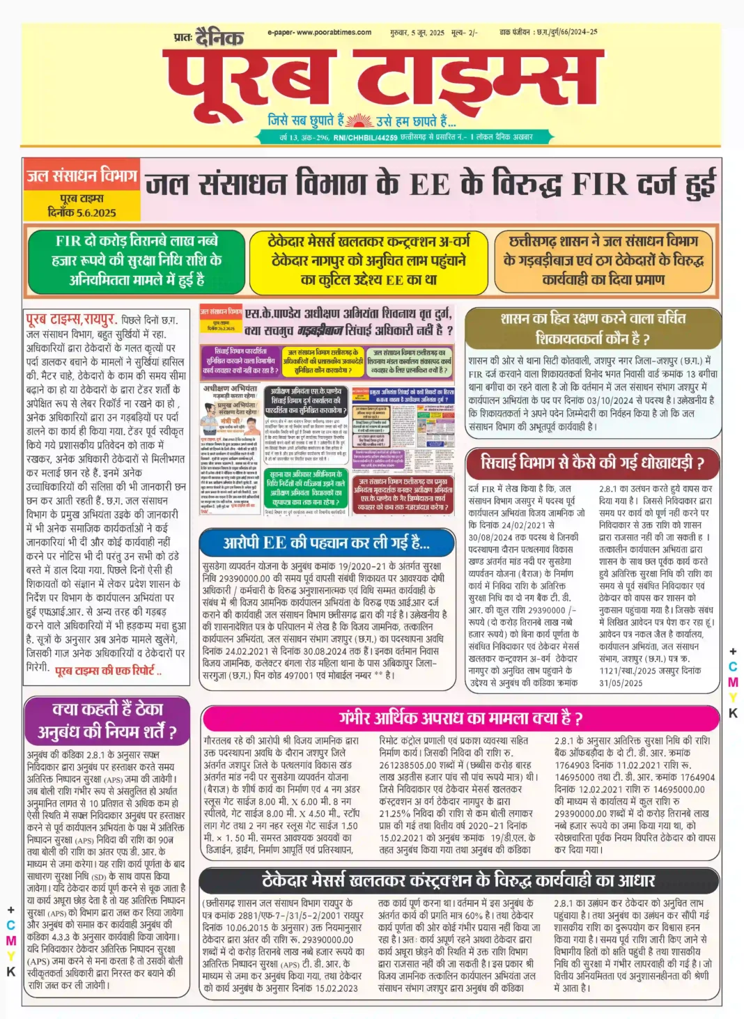 पूरब टाइम्स , रायपुर . पिछले दिनों छ.ग. जल संसाधन विभाग , बहुत सुर्खियों में रहा . अधिकारियों द्वारा ठेकेदारों के गलत कृत्यों पर पर्दा डालकर बचाने के मामलों ने सुर्खियां हासिल की . मैटर चाहे , ठेकेदारों के काम की समय सीमा बढ़ाने का हो या ठेकेदारों के द्वारा टेंडर शर्तों के अपेक्षित रूप से लेबर रिकॉर्ड ना रखने का हो , अनेक अधिकारियों द्वारा उन गड़बड़ियों पर पर्दा डालने का कार्य ही किया गया . टेंडर पूर्व स्वीकृत किये गये प्रशासकीय प्रतिवेदन को ताक में रखकर , अनेक अधिकारी ठेकेदारों से मिलीभगत कर मलाई छान रहे हैं . इनमें अनेक उच्चाधिकारियों की संलिप्ता की भी जानकारी छन छन कर आती रहती हैं . छ.ग. जल संसाधन विभाग के प्रमुख अभियंता उइके की जानकारी में भी अनेक समाजिक कार्यकर्ताओं ने कई जानकारियां भी दीं और कोई कार्यवाही नहीं करने पर नोटिस भी दी परंतु उन सभी को ठंडे बस्ते में डाल दिया गया . पिछले दिनों ऐसी ही शिकायतों को संज्ञान में लेकर प्रदेश शासन के निर्देश पर विभाग के कार्यपालन अभियंता पर हुई एफ.आई.आर. से अन्य तरह की गड़बड़ करने वाले अधिकारियों में भी हड़कम्प मचा हुआ है . सूत्रों के अनुसार अब अनेक मामले खुलेंगे, जिसकी गाज अनेक अधिकारियों व ठेकेदारों पर गिरेगी . पूरब टाइम्स की एक रिपोर्ट ..
