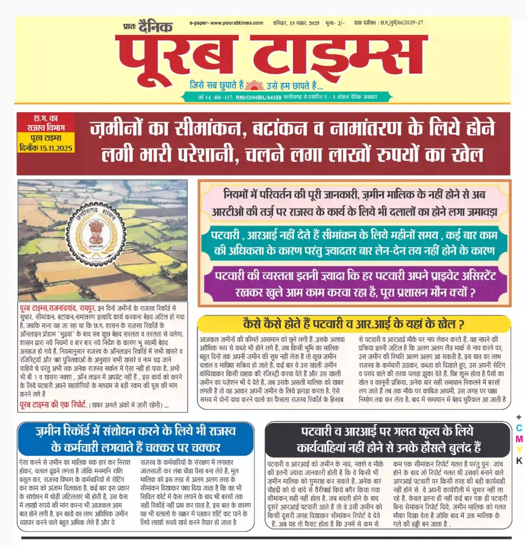 पूरब टाइम्स, राजनांदगांव, रायपुर . इन दिनों ज़मीनों के राजस्व रिकॉर्ड में सुधार, सीमांकन, बटांकन, नामांतरण इत्यादि कार्य करवाना बेहद जटिल हो गया है. जबकि माना यह जा रहा था कि छ.ग. शासन के राजस्व रिकॉर्ड के ऑनलाइन प्रोग्राम ‘ भुइयां’ के बाद सबकुछ बेहद सरलता व तरलता से चलेगा. शासन द्वारा नये नियमों व बार बार नये निर्देश के कारण भू स्वामी बेहद असहज हो गये हैं . नियमानुसार राजस्व के ऑनलाइन रिकॉर्ड में सभी खसरे व रजिस्ट्रियों और ऋण पुस्तिकाओं के अनुसार सभी खसरे व नाम चढ़ जाने चाहिये थे परंतु अभी तक अनेक राजस्व सर्कल में ऐसा नहीं हो पाया है. अभी भी बी 1 व खसरा नक्शा , ऑन लाइन में अपडेट नहीं हैं, इस कार्य को करने के लिये पटवारी अपने सहयोगियों के माध्यम से बड़ी रकम की घूस की मांग करने लगे हैं . पूरब टाइम्स की एक रिपोर्ट( खबर अगले अंकों मे ज़ारी रहेगी ) ..