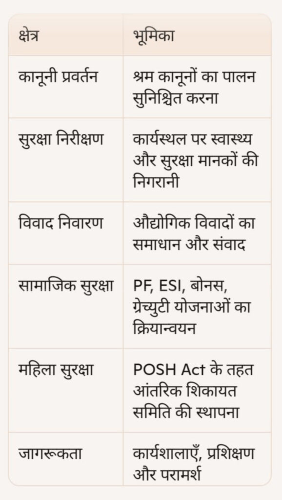 जिला श्रम आयुक्त कार्यालय का पदेन कार्य है कि उसे नियमित तौर पर कारखाना / कार्यालय का निरीक्षण कर यह देखना होता हैं कि सुरक्षा उपकरण, स्वास्थ्य सुविधाएँ और कार्य परिस्थितियाँ मानक के अनुरूप श्रमिकों की सुरक्षा और उनके हितों की रक्षा हो रही है व महिला कर्मचारियों के लिए POSH Act, 2013 के तहत आंतरिक शिकायत समिति की स्थापना तथा नियमानुसार कार्यान्वयन होने की सुनिश्चितता कर निगरानी करना होता है । - विवाद निवारण करने में निर्णायक भूमिका निभाना।