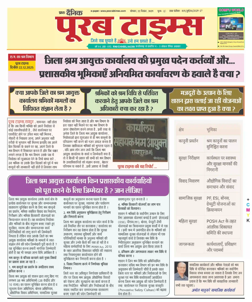 पूरब टाइम्स, रायपुर . सामन्यत: यही होता है कि जब किसी श्रमिक को अपने नियोक्ता से कोई तकलीफ होती है , जैसे कार्यस्थल पर एक्सीडेंट होने पर उचित मदद नहीं मिलना , नौकरी से निकाला जाना, अपने अनुसार सही तरीक़े से भुगतान नहीं मिलना इत्यादि तब अपने हित चिंतकों के कहने पर वह, अपने जिले के श्रम विभाग में शिकायत करता है और फिर चक्कर लगाने लगता है कि श्रम विभाग उसके पक्ष में नियोक्ता को मुआवजा देने के लिये बाध्य करे . उस श्रमिक या उसके हित चिंतकों को पूर्व में श्रम कानूनों की जानकारी नहीं होती है जिसका लाभ नियोक्ता को मिल जाता है और श्रम विभाग के द्वरा राहत नहीं मिलने पर वह श्रम विभाग के ऊपर दोषारोपण करने लगता है . इसी तरह से अनेक जिले के जिला श्रम आयुक्त कार्यालय , नियोक्ताओं द्वारा शुरुआत से ही श्रम कानूनों के परिपालन नहीं करने को नजऱ अंदाज़ करता है जिसका खामियाजा श्रमिकों को भुगतना पड़ता है . यदि आम लोग जान जायें कि जिला श्रम आयुक्त कार्यालय के कार्य व जिम्मेदारी क्या हैं , तो वे किसी भी प्रकार की कमी को श्रम विभाग के उच्चाधिकारियों को संज्ञान करवा , बेहतर परिणाम पा सकते हैं . इसी आशय से लिखी पूरब टाइम्स की यह रिपोर्ट …