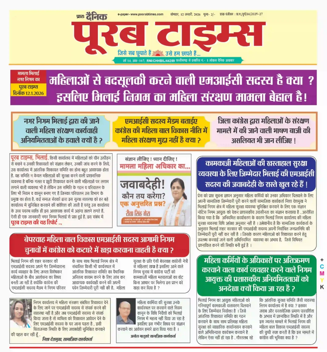 भिलाई निगम की शहर सरकार की एमआईसी सदस्य अपने गैर जिम्मेदाराना कार्य व्यवहार के लिए जनता विशेषकर महिलाओं के बीच आलोचना का विषय बनती जा रहीं है क्योंकि कांग्रेस की एमआईसी सदस्य मैडम ने निगम परिसर के साथ साथ भिलाई निगम क्षेत्र में संचालित किसी भी कार्यस्थल में आंतरिक शिकायत समिति का वैधानिक अस्तित्व कायम करने के लिए जांच कर आवश्यक कार्यवाही करने की अपनी पदेन जिम्मेदारी पूरी नहीं की है. महिला सुरक्षा के प्रति ऐसी बेपरवाह कांग्रेसी नेत्री से महिलाएं खफा है इसलिए आने वाले निगम चुनाव में कांग्रेस पार्टी को कामकाजी महिला मतदाताओं का वोट किस आधार पर मिलेगा इस प्रश्न को खड़ा कर दिया है ?