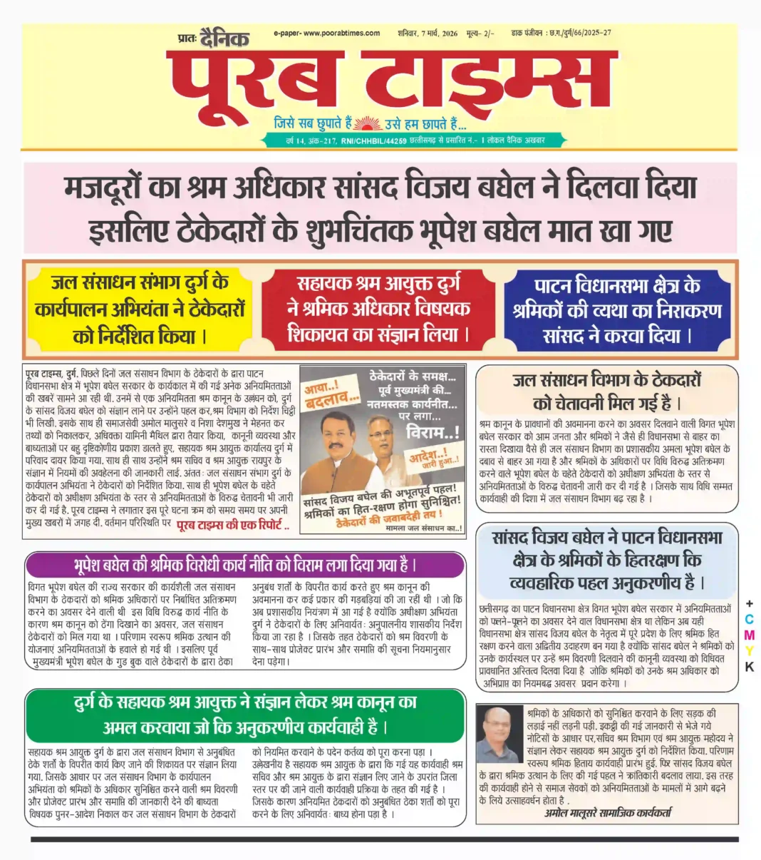 पूरब टाइम्स, दुर्ग. पिछले दिनों जल संसाधन विभाग के ठेकेदारों के द्वारा पाटन विधानसभा क्षेत्र में भूपेश बघेल सरकार के कार्यकाल में की गई अनेक अनियमितताओं की खबरें सामने आ रही थीं . उनमें से एक अनियमितता श्रम कानून के उल्लंघन को , दुर्ग के सांसद विजय बघेल को संज्ञान लाने पर उन्होंने पहल कर , श्रम विभाग को निर्देश चिट्ठी भी लिखी . इसके साथ ही समाजसेवी अमोल मालुसरे व निशा देशमुख ने मेहनत कर तथ्यों को निकालकर , अधिवक्ता यामिनी मैथिल द्वारा तैयार किया , कानूनी व्यवस्था और बाध्यताओं पर बहु दृष्टिकोणीय प्रकाश डालते हुए, सहायक श्रम आयुक्त कार्यालय दुर्ग में परिवाद दायर किया गया . साथ ही साथ उन्होंने श्रम सचिव व श्रम आयुक्त रायपुर के संज्ञान में नियमों की अवहेलना की जानकारी लाई . अंतत: जल संसाधन संभाग दुर्ग के कार्यपालन अभियंता ने ठेकेदारों को निर्देशित किया . साथ ही भूपेश बघेल के चहेते ठेकेदारों को अधीक्षण अभियंता के स्तर से अनियमितताओं के विरुद्ध चेतावनी भी जारी कर दी गई है . पूरब टाइम्स ने लगातार इस पूरे घटना क्रम को समय समय पर अपनी मुख्य खबरों में जगह दी. वर्तमान परिस्थिति पर पूरब टाइम्स की एक रिपोर्ट ..