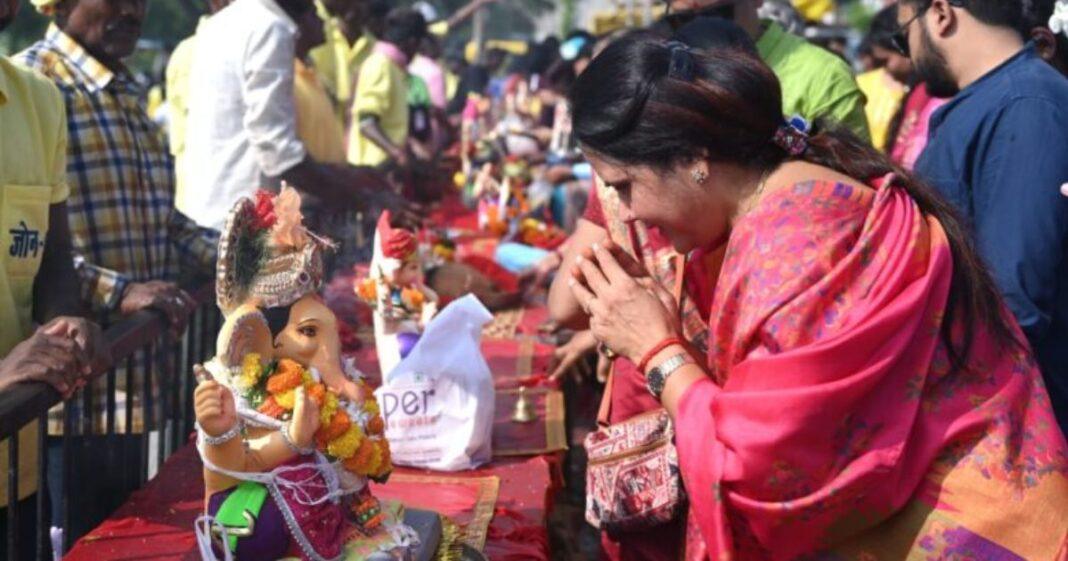 रायपुर – आज राजधानी शहर की प्रथम नागरिक नगर पालिक निगम रायपुर की महापौर श्रीमती मीनल चौबे ने अपने निवास स्थान पर श्रीगणेश उत्सव में परम्परागत तौर पर विघ्नहर्ता भगवान श्रीगणेश की मूर्ति की पूजा – अर्चना करने के पश्चात आज अनंत चतुर्दशी पर्व के पावन अवसर पर अपने परिजनों के साथ महादेवघाट खारून नदी के समीप नगर निगम रायपुर के विसर्जन कुण्ड में पहुंचकर पति छगन चौबे ( पूर्व पार्षद रायपुर नगर पालिक निगम ) सहित परिजनों के साथ प्रथम पूज्य देव श्री गणपति की पूजा – अर्चना, आरती कर अगले वर्ष जल्दी आने की प्रार्थना सहित सभी नगरवासियों के जीवन में सुख, समृद्धि, स्वास्थ्य, शान्ति और शुभत्व प्रदान करने और रायपुर शहर को सुन्दर विकसित स्मार्ट राजधानी बनाने सकारात्मक शक्ति प्रदान करने हेतु विनम्र प्रार्थना श्रीगणेश के दिव्य श्रीचरणों में की.