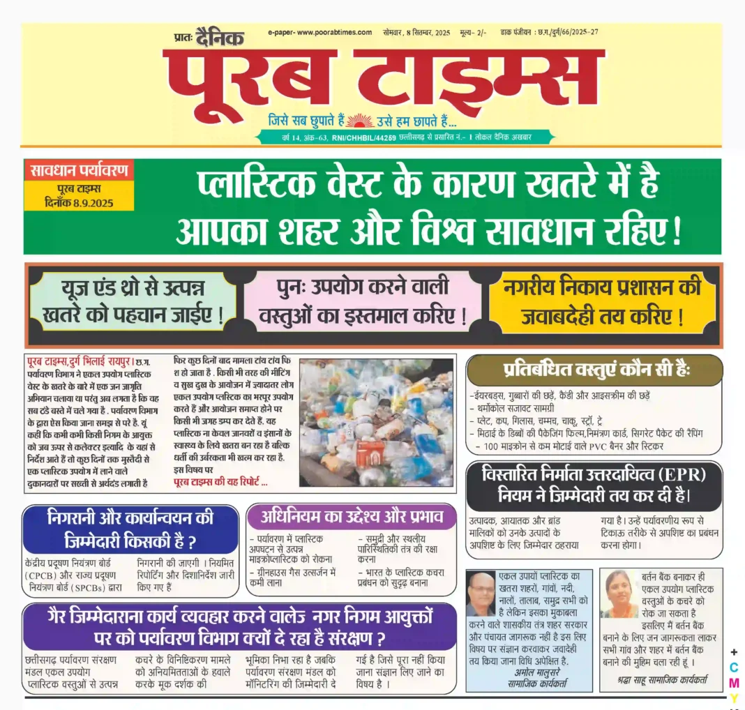 पूरब टाइम्स, दुर्ग भिलाई रायपुर । छ.ग. पर्यावरण विभाग ने एकल उपयोग प्लास्टिक वेस्ट के खतरे के बारे में एक जन जागृति अभियान चलाया था परंतु अब लगता है कि वह सब ठंडे बस्ते में चले गया है . पर्यावरण विभाग के द्वारा ऐस किया जाना समझ से परे है . यूं कहीं कि कभी कभी किसी निगम के आयुक्त को जब ऊपर से कलेक्टर इत्यादि के यहां से निर्देश आते हैं तो कुछ दिनों तक मुस्तैदी से एक प्लास्टिक उपयोग में लाने वाले दुकानदारों पर सख्ती से अर्थदंड लगाती है फिर कुछ दिनों बाद मामला टांय टांय फिश हो जाता है . किसी भी तरह की मीटिंग व सुख दुख के आयोजन में ज़्यादातर लोग एकल उप्योग प्लस्टिक का भरपूर उपयोग करते हैं और आयोजन समाप्त होने पर किसी भी जगह डम्प कर देते हैं. यह प्लास्टिक ना केवल जानवरों व इंसानों के स्वास्थ्य के लिये खतरा बन रहा है बल्कि धर्ती की उर्बरकता भी खत्म कर रहा है. इस विषय पर पूरब टाइम्स की यह रिपोर्ट ..