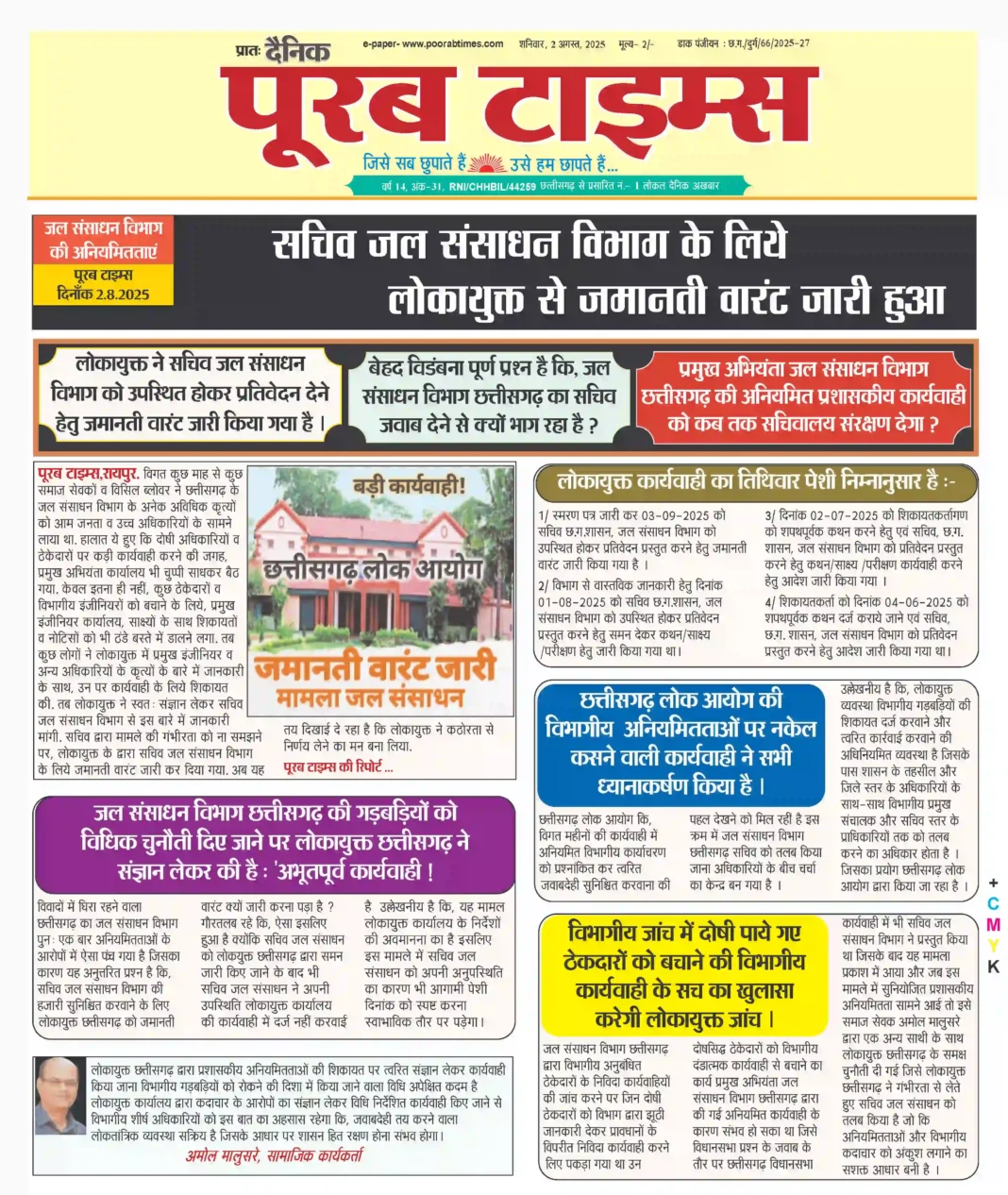 पूरब टाइम्स, रायपुर . विगत कुछ माह से कुछ समाज सेवकों व विसिल ब्लोवर ने छत्तीसगढ़ के जल संसाधन विभाग के अनेक अविधिक कृत्यों को आम जनता व उच्च अधिकारियों के सामने लाया था. हालात ये हुए कि दोषी अधिकारियों व ठेकेदारों पर कड़ी कार्यवाही करने की जगह, प्रमुख अभियंता कार्यालय भी चुप्पी साधकर बैठ गया. केवल इतना ही नहीं, कुछ ठेकेदारों व विभागीय इंजीनियरों को बचाने के लिये, प्रमुख इंजीनियर कार्यालय, साक्ष्यों के साथ शिकायतों व नोटिसों को भी ठंडे बस्ते में डालने लगा. तब कुछ लोगों ने लोकायुक्त में प्रमुख इंजीनियर व अन्य अधिकारियों के कृत्यों के बारे में जानकारी के साथ, उन पर कार्यवाही के लिये शिकायत की. तब लोकायुक्त ने स्वतः संज्ञान लेकर सचिव जल संसाधन विभाग से इस बारे में जानकारी मांगी . सचिव द्वारा मामले की गंभीरता को ना समझने पर, लोकायुक्त के द्वारा सचिव जल संसाधन विभाग के लिये जमानती वारंट जारी कर दिया गया . अब यह तय दिखाई दे रहा है कि लोकायुक्त ने कठोरता से निर्णय लेने का मन बना लिया . पूरब टाइम्स की रिपोर्ट ..