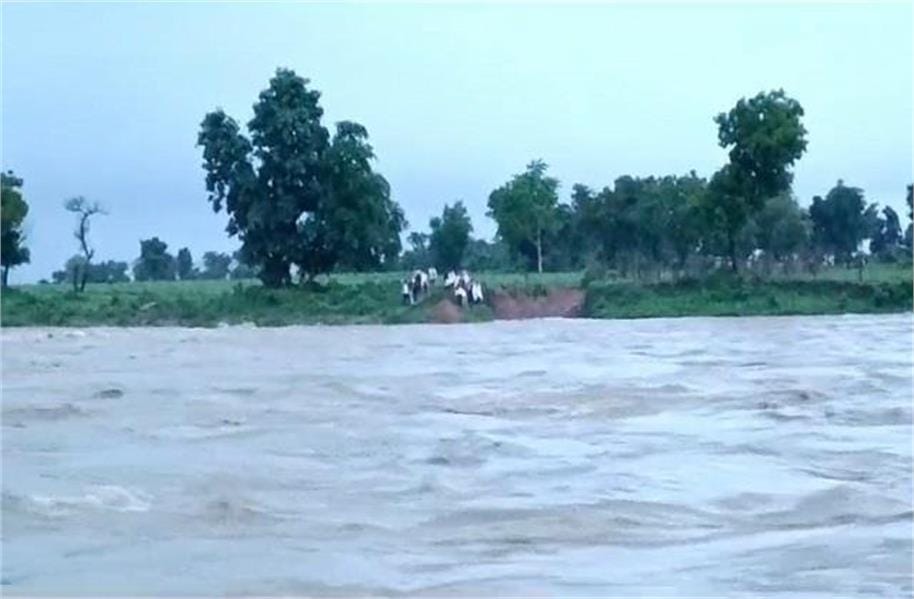 छतरपुर में तेज बारिश की वजह से धसान नदी में अचानक बाढ़ आ गई। नदी में पानी का बहाव अचानक बढ़ने से घुवारा तहसील के कुटोरा गुर्जन मंदिर के पास 48 चरवाहे और मजदूर आठ घंटे फंसे रहे। जैसे कैसे सूचना पुलिस प्रशासन को मिली। एसडीआरएफ टीम ने मौके पर पहुंचकर रेस्क्यू चलाकर सभी को बचाया।दरअसल, ग्राम कटोरा में धसान नदी के उस पार एक मंदिर का निर्माण कार्य चल रहा है जिसमें कुछ लोग गए हुए थे, साथ ही चरवाहे भी जानवर चरा रहे थे। धसान नदी का जल स्तर अचानक बढ़ जाने के कारण ग्रामीण धसान नदी के उस पार टापू में फंस गए। पुलिस कंट्रोल रूम एवं स्थानीय लोगों के माध्यम से सूचना प्राप्त होते ही छतरपुर पुलिस एवं प्रशासन की टीम मौके पर पहुंची। साथ ही एसडीआरएफ की टीम बचाव संसाधन के साथ मौके पर पहुंची। बचाव कार्य में जुटी टीम नदी पार कर टापू पर पहुंची। टापू में फंसे 59 ग्रामीणों और चरवाहों को सुरक्षित टापू से वापस लाया गया।